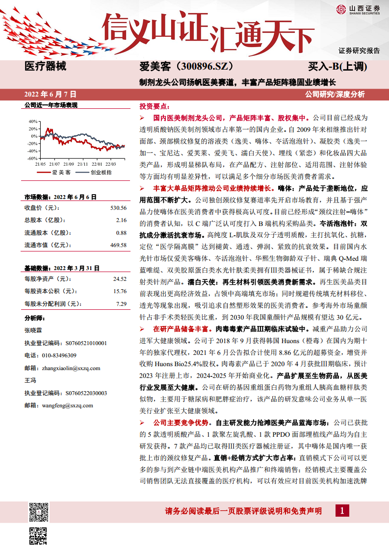 - 行业领先地位与产品创新历程: 爱美客成立于2004年8月,是一家专注于生物医用材料研发、生产和销售的国家级高新技术企业。公司是国内首家获得药监局批准用于面部软组织修复的注射透明质酸钠医疗器械产品证书的企业,目前已成为透明质酸钠医美制剂领域的国内市场占有率第一的企业。自2009年以来,公司平均每1-2年推出一款新品,通过持续创新确保产品生命周期的有效接力。