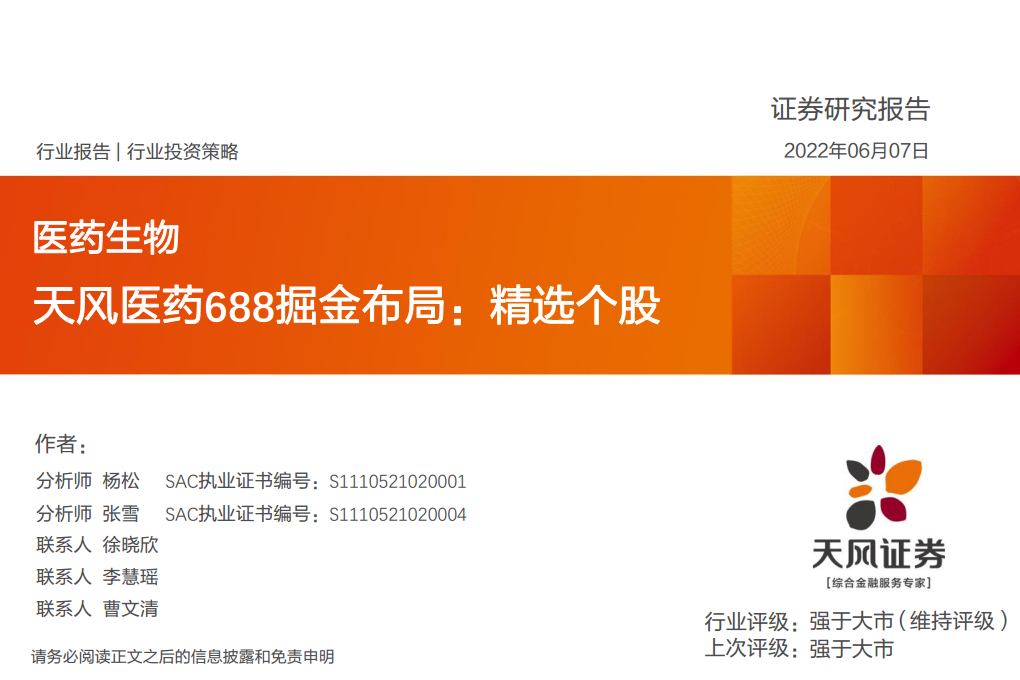 基于上述三大逻辑,报告精选了以下“天风医药688”组合:百济神州-U、君实生物-U、诺唯赞、纳微科技、海尔生物、爱博医疗、百克生物、荣昌生物、南微医学、心脉医疗、惠泰医疗、键凯科技、特宝生物、悦康药业、海泰新光。