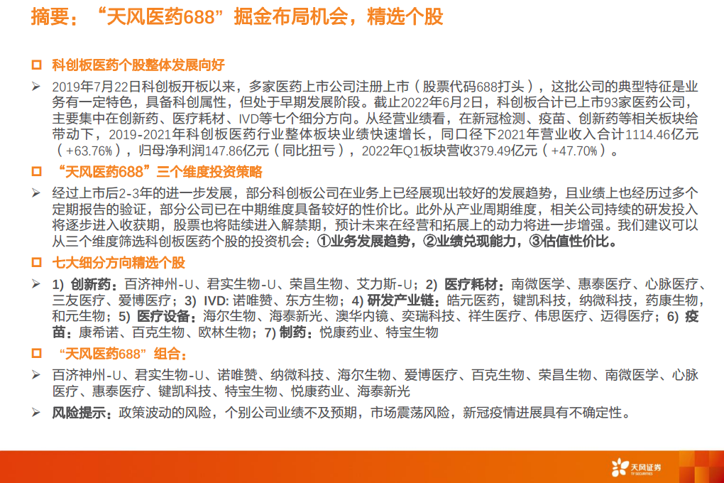 报告提出了“天风医药688”的三大投资策略维度:业务发展趋势、业绩兑现能力和估值性价比。基于这三大逻辑,报告精选了创新药、医疗耗材、IVD、研发产业链、医疗设备、疫苗和制药七大细分方向的优质个股。这些精选个股不仅在各自领域具有领先优势,且在研发投入、商业化能力、股权激励和并购整合等方面表现突出。报告特别指出,科创板医药公司研发投入强度显著高于其他板块,2022年第一季度研发费用率高达18.51%,为企业长期发展提供了强劲动能。同时,近半数公司已实施股权激励,部分公司积极开展并购整合,进一步增强了经营和拓展动力。报告最终推荐了包括百济神州-U、君实生物-U、诺唯赞、纳微科技、海尔生物等在内的“天风医药688”组合,以期在政策波动、业绩不及预期和市场震荡等风险下,为投资者提供专业的投资参考。