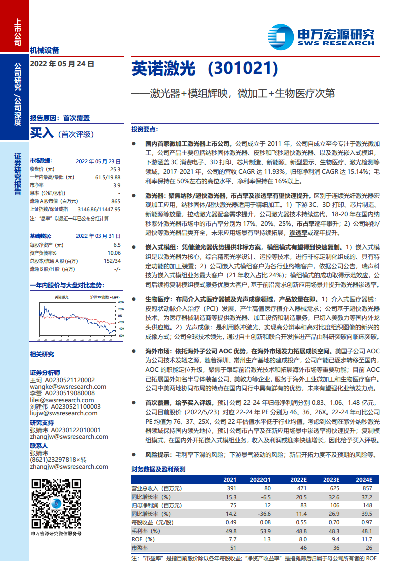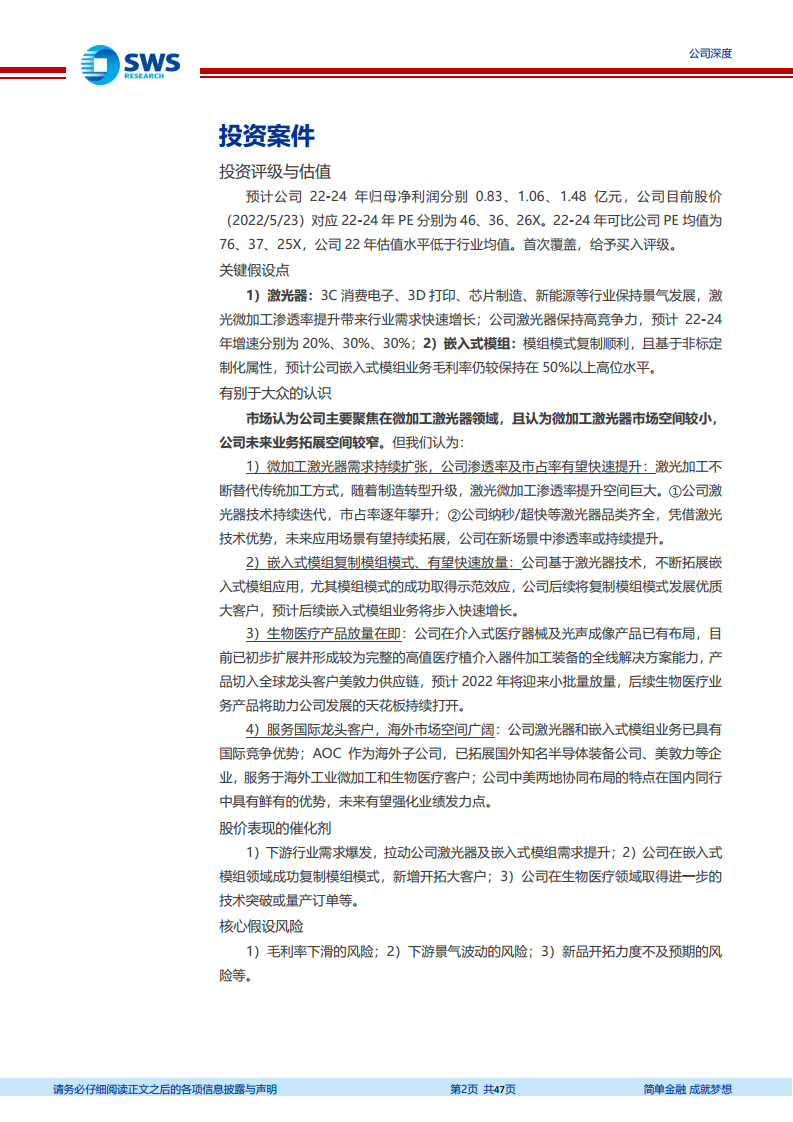 - 估值与评级: 报告选取炬光科技、锐科激光、杰普特、铂力特、帝尔激光作为可比公司。公司目前股价(2022/5/23)对应2022-2024年PE分别为46、36、26倍,低于可比公司2022年PE均值76倍。考虑到公司在紫外纳秒激光器领域的领先地位、市场占有率和渗透率的快速提升、模组模式的成功复制以及中美研发协同优势,首次覆盖给予“买入”评级。