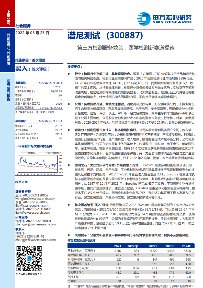 谱尼测试作为国内第三方检测行业的领军企业,凭借其全面的资质认证、稳健的业绩增长以及前瞻性的战略布局,在广阔的检测市场中占据优势地位。公司通过持续的内生增长和外延并购,积极拓展军工、汽车、生命科学、电子电气等高附加值新兴检测领域,并受益于医学检测(特别是新冠核酸检测常态化)带来的业绩弹性,展现出强大的市场竞争力和盈利增长潜力。