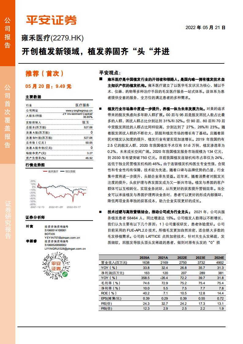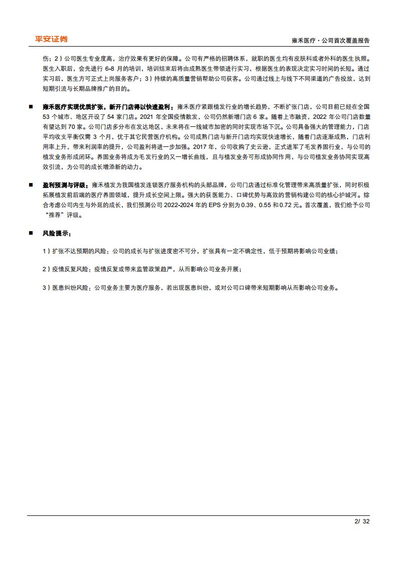 综合考虑公司内生与外延的成长,预计雍禾医疗2022-2024年主营业务收入分别为27.49亿元、37.13亿元和48.42亿元,同比增速分别为26%、35%和30%。预测公司2022-2024年的EPS分别为0.39元、0.55元和0.72元。鉴于雍禾医疗作为植发连锁医疗服务机构的头部品牌,其标准化管理带来的高质量扩张,以及积极拓展医疗养固领域提升成长空间,首次覆盖给予公司“推荐”评级。