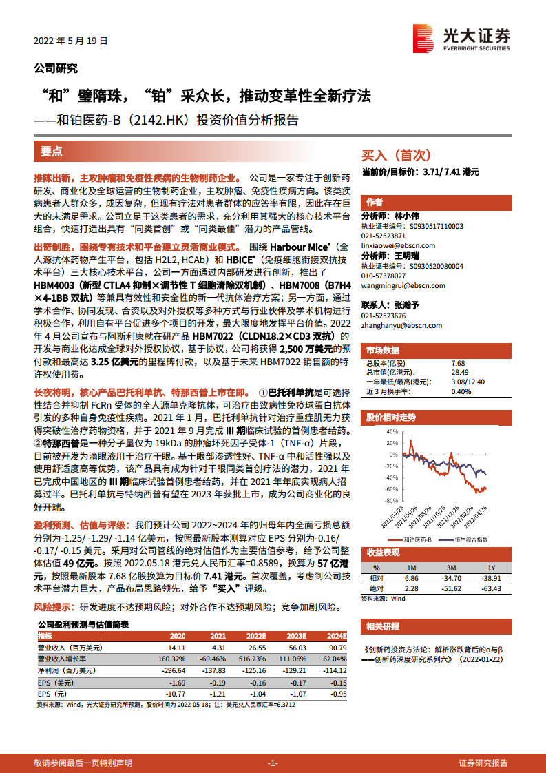 - 相对估值:采用市值/研发费用方法。和铂医药当前市值/2021年研发费用约为4倍,低于可比公司平均值6倍和中位数7倍,表明市场对其价值认知可能不足。