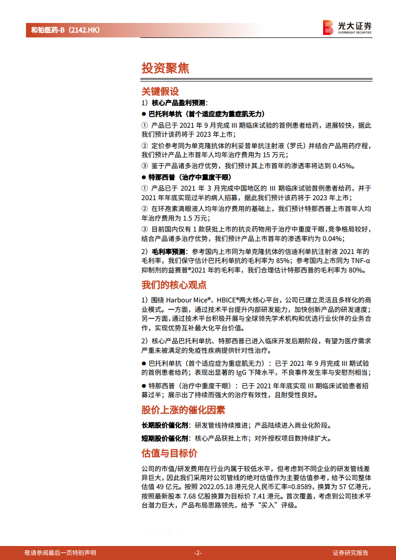 - 绝对估值:对临近商业化的巴托利单抗和特那西普进行DCF估值。假设成功上市概率80%,WACC为8%,永续增长率-2%,加上2021年底现金14亿元,得出公司整体估值49亿元人民币。