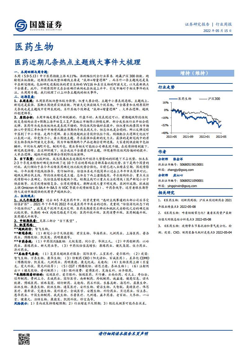 本周医药生物行业表现强势,申万医药指数上涨4.11%,跑赢沪深300指数。市场主要由“底部+增量逻辑”和新冠相关热点主题线驱动,包括君实生物VV116、真实生物阿兹夫定和千金藤素等药物的研发进展,以及对不明原因肝炎的关注。政策层面,《“十四五”生物经济发展规划》和“步行15分钟核酸采样圈”等利好政策为行业发展提供了长期指引和短期催化。尽管行业估值仍处于历史平均水平之下,但成交额占比上升显示市场热度回升。展望未来,医药板块在业绩确定性和筹码出清方面具备比较优势,短期可关注疫情线和中药条线,长期则应聚焦“4+X”战略框架下的科技创新、制造升级、消费升级和模式升级等主线,并谨慎选择受疫情影响小、确定性高、低估值高增长的超跌个股,以把握结构性投资机会。