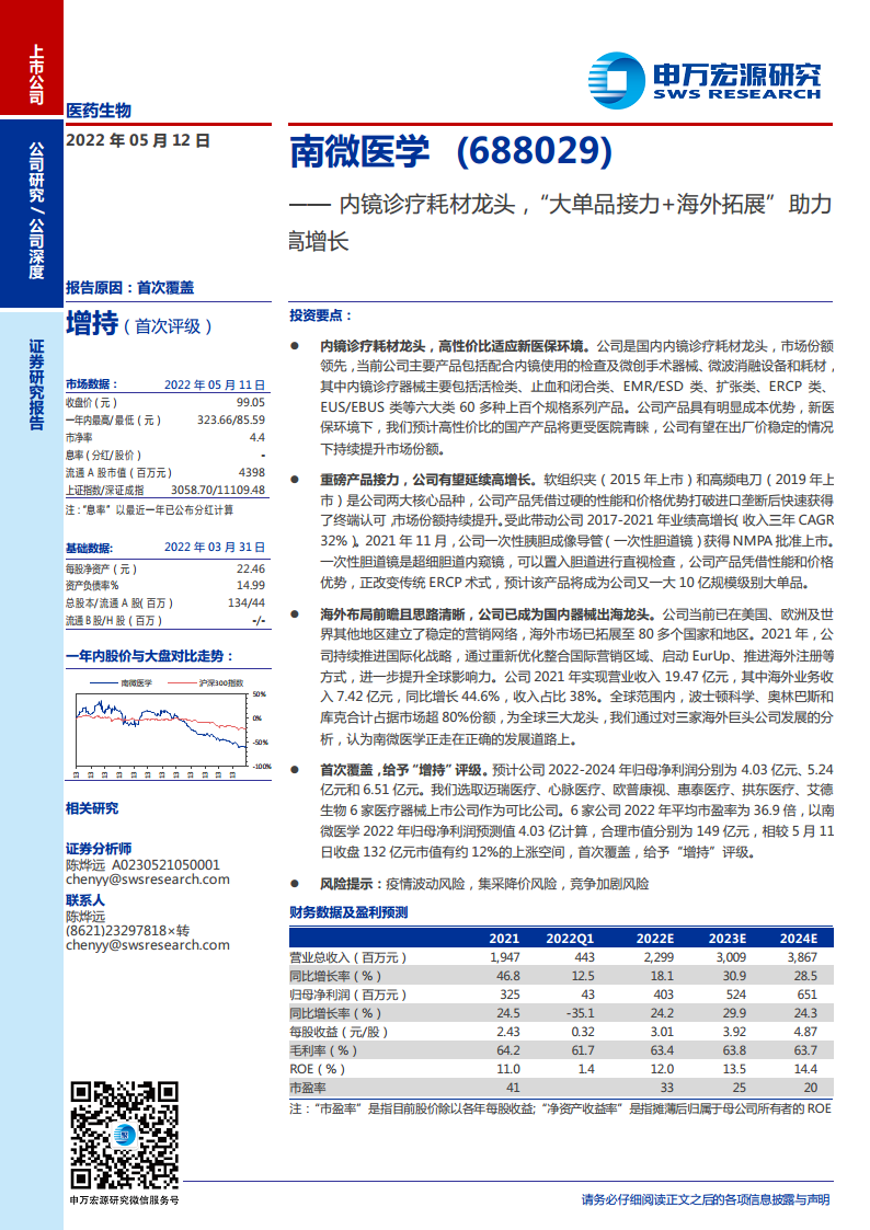 中心思想 内镜诊疗耗材龙头地位与高增长驱动力 南微医学作为国内内镜诊疗耗材领域的领军企业,凭借其领先的市场份额和丰富的产品线,在新医保环境下,以高性价比的国产产品优势,有望持续提升市场份额。公司核心产品软组织夹和高频电刀已成功实现进口替代并快速放量,带动2017-2021年收入复合年增长率达32%。新上市的一次性胆道镜预计将成为又一十亿级大单品,持续驱动业绩高速增长。 公司建立了前瞻且清晰的国际化战略,通过优化全球营销网络、启动区域发展计划及加速海外注册,已成为国内医疗器械“出海”的典范。2021年海外业务收入7.42亿元,同比增长44.6%,占总收入的38%,显示出强劲的国际竞争力。 创新模式与广阔市场潜力 南微医学构建了以医学创新成果转化平台为核心的“1+3+N”持续创新模式,依托内镜诊疗、肿瘤消融、光学相干断层扫描成像(OCT)三大技术平台,通过医工合作不断推出具有国际先进水平的创新产品,如可携带125I放射粒子支架、三臂夹等,巩固了技术领先地位。 中国消化系统疾病高发,但内镜检查渗透