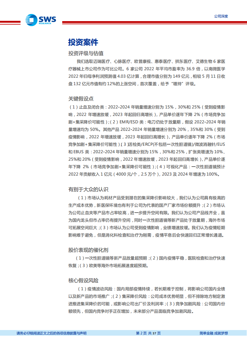 • 南微医学作为国内内镜诊疗耗材领域的领军企业,凭借其领先的市场份额和丰富的产品线,在新医保环境下,以高性价比的国产产品优势,有望持续提升市场份额。公司核心产品软组织夹和高频电刀已成功实现进口替代并快速放量,带动2017-2021年收入复合年增长率达32%。新上市的一次性胆道镜预计将成为又一十亿级大单品,持续驱动业绩高速增长。