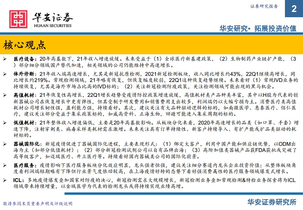 - 业绩表现: 2021年高值耗材板块收入同比增长约32%,在2020年低基数下快速恢复。然而,2022年第一季度受国内疫情防控政策影响,收入增速放缓至6.96%。归母净利润增速(2021年24%)低于收入端,2022年第一季度受疫情影响有所下降至-4.84%。