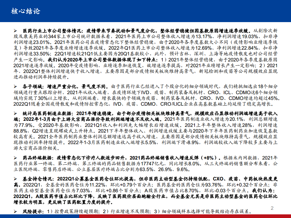 2021年及2022年第一季度,中国医药行业在疫情和政策双重影响下展现出韧性,整体经营稳健但细分领域景气度高度分化。新冠检测、疫苗、CXO、制药装备及耗材、ICL等疫情相关及创新驱动型板块表现突出,成为行业增长亮点。尽管部分传统领域如创新药(受集采影响)、特色原料药(受成本影响)、药店和流通(受疫情扰动)面临挑战,但其长期增长逻辑和结构性机遇依然存在。基金持仓数据显示市场对医药行业的配置意愿提升,尤其青睐高景气和具备核心竞争力的细分领域。未来,医药行业将继续深化结构性调整,国产创新、进口替代、消费升级以及产业集中化将是驱动行业发展的核心趋势。投资者需密切关注政策变化、疫情演进以及各细分领域的差异化表现,以把握潜在的投资机会。