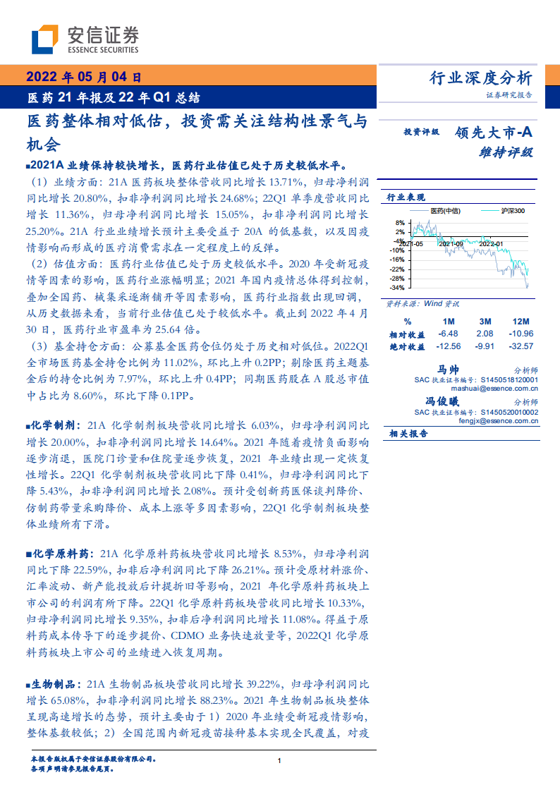 2021年,中国医药行业在低基数和需求反弹的驱动下实现了稳健增长,但2022年第一季度受疫情散发影响,增速有所放缓。当前行业整体估值处于历史低位,公募基金持仓集中于龙头企业,显示出市场对结构性机会的青睐。细分板块表现分化显著:生物制品、CXO和生命科学服务等创新驱动型和高景气度领域持续高增长;中药板块在政策支持和消费品提价的背景下,长期发展拐点已至,但短期受疫情影响;化学制剂和医药商业则面临医保控费、带量采购和疫情管控带来的业绩压力;医疗器械板块在疫情相关产品带动下表现亮眼,但传统业务仍需等待疫情平复。投资者应关注全球疫情不确定性、研发审批风险及产品质量问题,并聚焦具备明确增长逻辑和政策免疫力的细分领域。