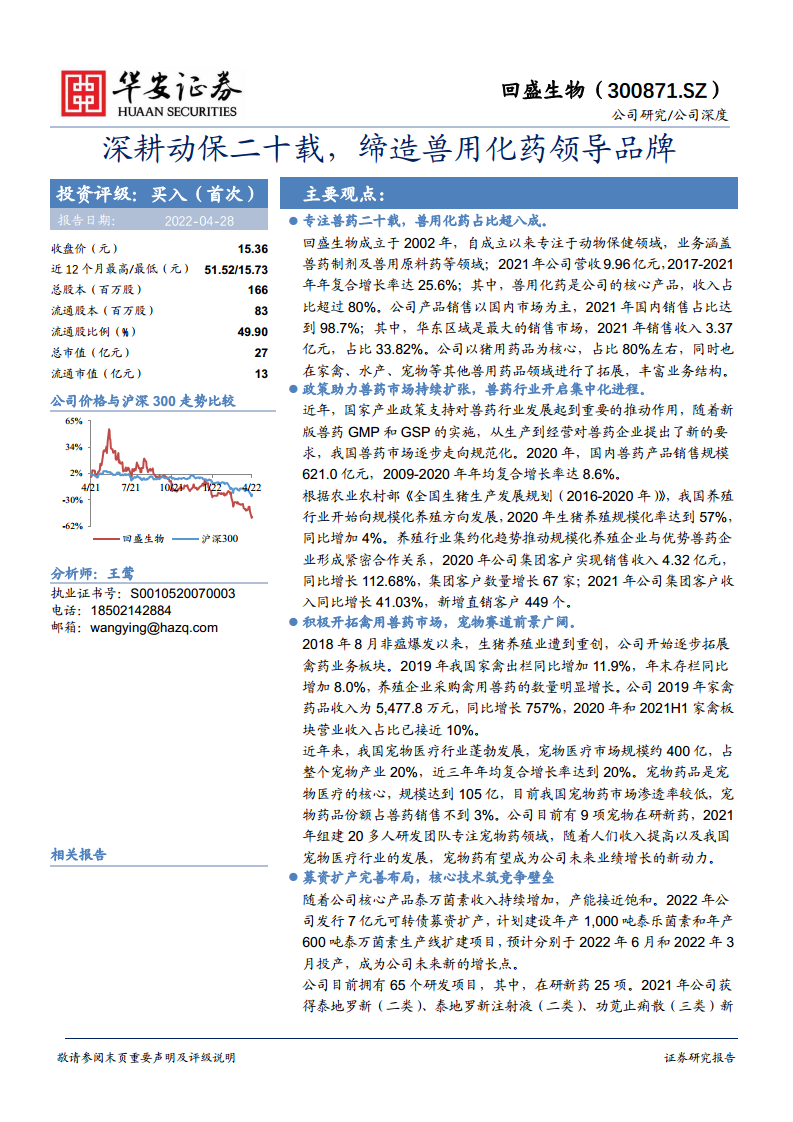 回盛生物作为深耕动保领域二十载的兽用化药领导品牌,凭借其在核心产品上的优势和持续的研发投入,在行业中占据稳固地位。面对政策推动下的行业集中化趋势和全球兽药市场的持续扩张,公司通过多元化战略布局,积极拓展家禽、宠物等新兴市场,并借助募资扩产和技术创新不断提升核心竞争力。尽管2021年面临下游市场和上游成本压力,但随着原料药价格趋稳和生猪养殖行业景气度回升,公司未来盈利能力有望改善。基于其稳健的业务基础、清晰的增长战略和持续的创新能力,回盛生物展现出良好的投资价值。