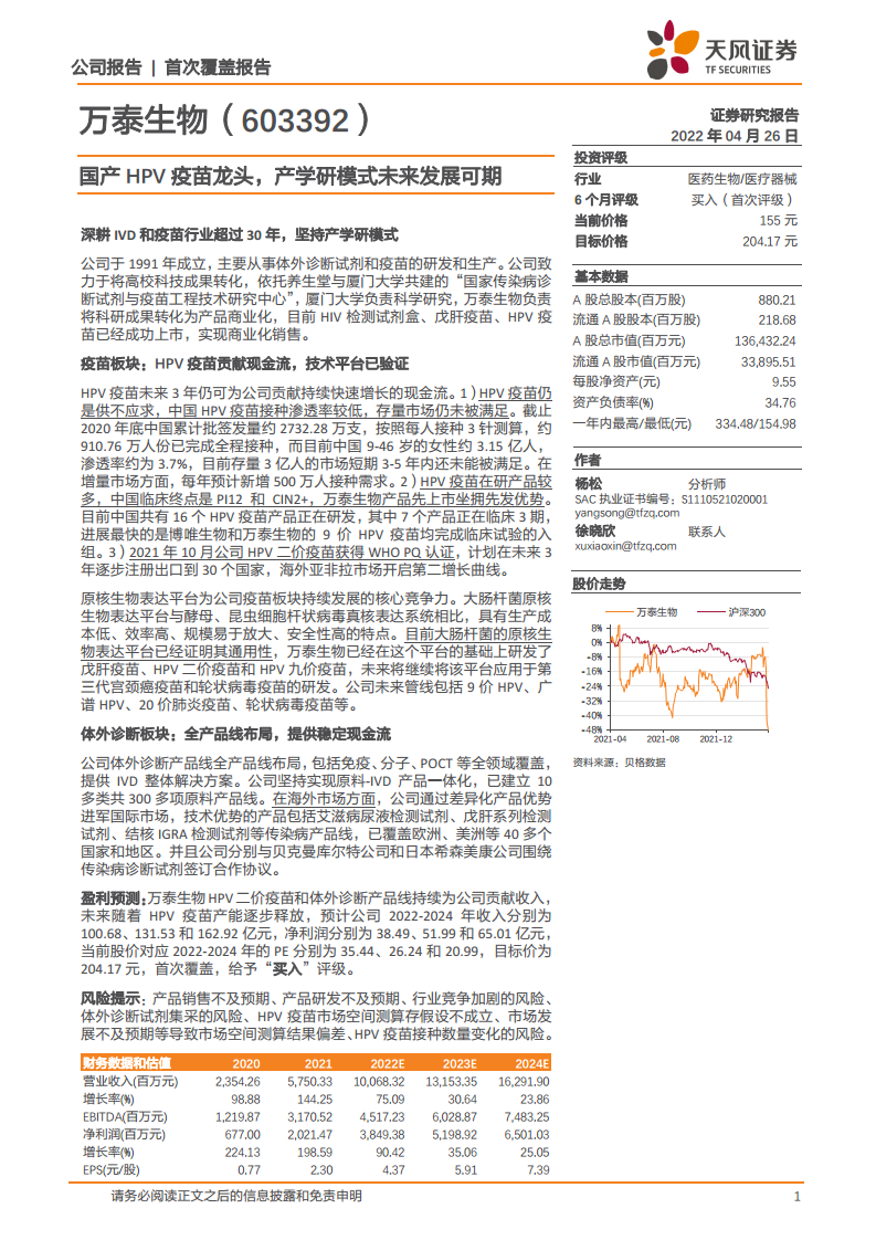 万泰生物凭借其深厚的产学研模式和在体外诊断及疫苗领域的长期深耕,已成为国产HPV疫苗的领军企业。公司二价HPV疫苗的成功上市和快速放量,以及未来九价HPV疫苗的潜力,将持续为公司贡献强劲现金流。同时,其全面的体外诊断产品线和核心原料自产能力,为公司提供了稳定的业绩支撑。面对中国HPV疫苗市场巨大的未满足需求和海外市场的拓展机遇,万泰生物有望通过其原核生物表达平台优势、产能扩张和国际认证,实现持续增长。然而,公司也面临产品销售不及预期、研发风险、行业竞争加剧以及体外诊断试剂集采等潜在风险。综合来看,万泰生物在医药生物领域具有显著的竞争优势和发展潜力,首次覆盖给予“买入”评级,目标价204.17元。
