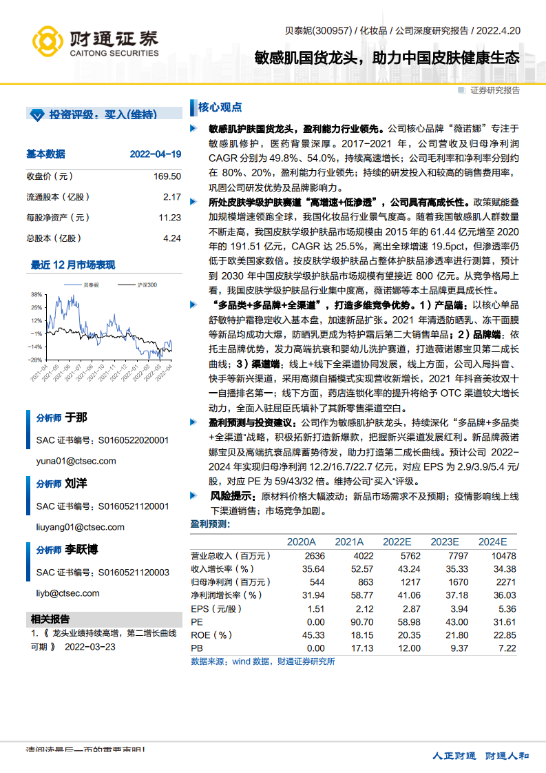 报告预计贝泰妮2022-2024年将实现归母净利润12.2/16.7/22.7亿元,对应EPS为2.9/3.9/5.4元/股,对应PE为59/43/32倍。鉴于公司作为国产护肤品龙头的高成长性,报告维持“买入”评级。同时,报告提示了原材料价格波动、新品市场需求不及预期、疫情影响销售以及市场竞争加剧等风险。