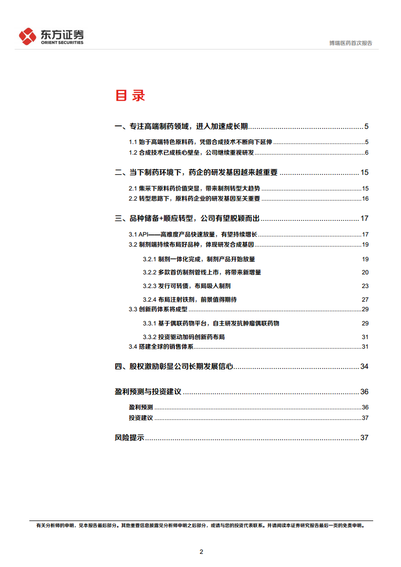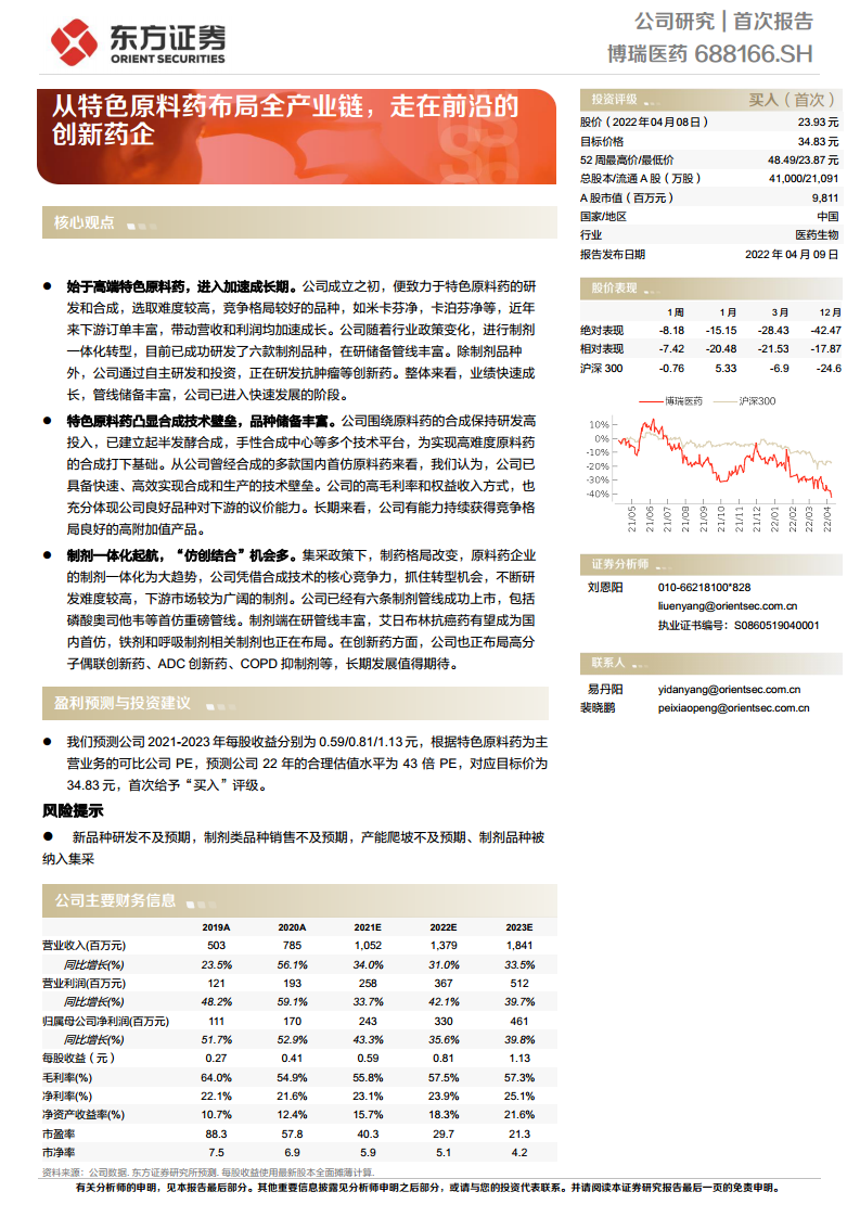 根据盈利预测,公司2021-2023年每股收益分别为0.59/0.81/1.13元。预计原料药销售将持续快速增长,制剂产品(如磺达肝癸钠、奥司他韦)将逐步放量,带动公司收入增长。综合毛利率预计在55.8%至57.5%之间波动。公司将持续加大研发投入,但随着销售收入的增长,研发费用率和管理费用率有望摊薄。基于特色原料药为主营业务的可比公司PE估值,预测公司2022年合理估值水平为43倍PE,对应目标价34.83元,首次给予“买入”评级。