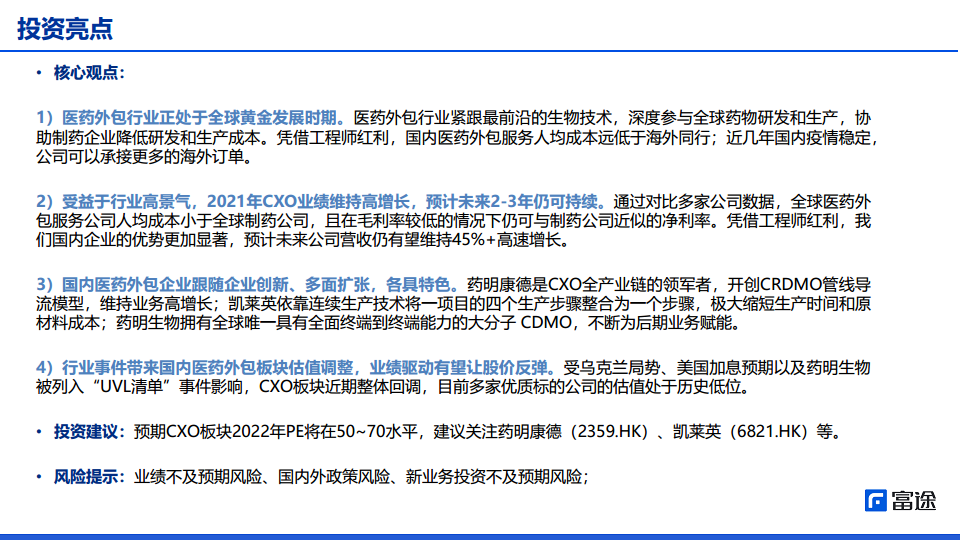 国内医药外包企业通过创新和多面扩张,形成了各具特色的竞争格局,如药明康德的全产业链CRDMO模式、凯莱英的连续生产技术以及药明生物的端到端大分子CDMO能力。尽管近期受乌克兰局势、美国加息预期及药明生物被列入“UVL清单”等行业事件影响,CXO板块估值有所调整,但多家优质标的已处于历史低位。报告认为,随着业绩的持续驱动,板块有望迎来股价反弹窗口,建议关注药明康德和凯莱英等龙头企业。