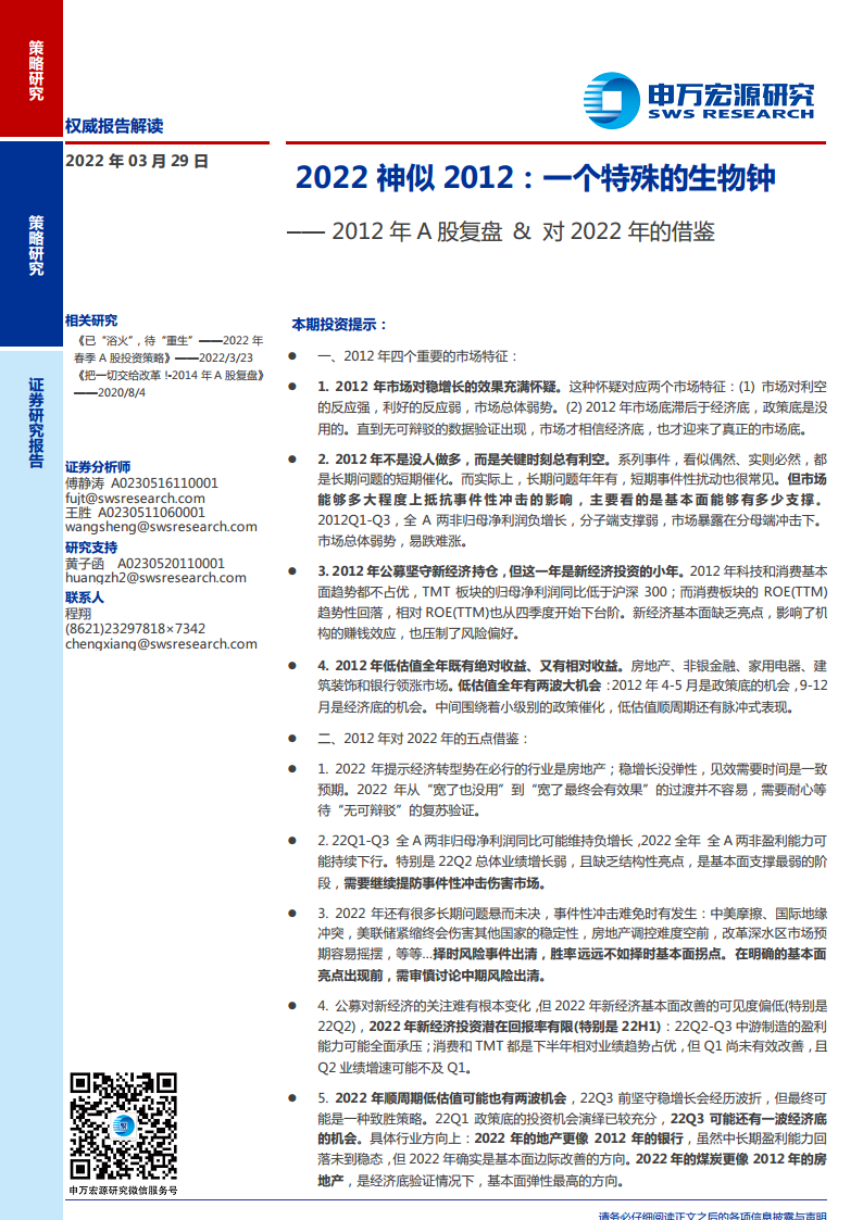 2012年A股复盘对2022年的借鉴:2022神似2012:一个特殊的生物钟