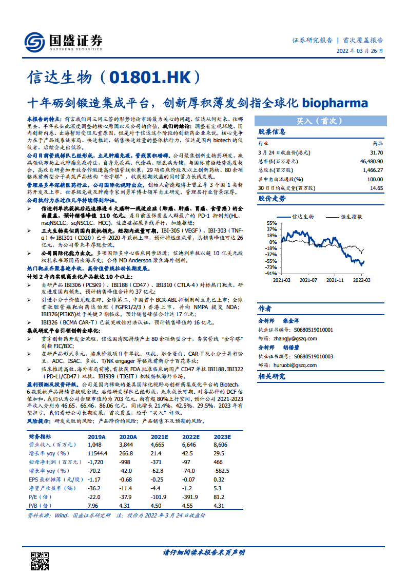 - 投资评级: 预计公司2023年有望扭亏。鉴于公司兼具国际化视野与创新药集成化平台,产品管线雄厚,商业化能力突出,且估值具有上行空间,首次覆盖给予“买入”评级。