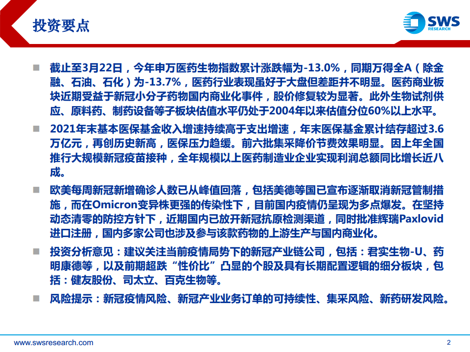 2022年春季,医药生物行业在市场震荡中展现出韧性,表现略优于大盘。医保基金结存创新高,医保压力趋缓,为行业发展提供了良好环境。2021年医药制造业企业利润总额大幅增长,显示行业整体向好。当前国内疫情多点爆发,催生了以新冠抗原检测、疫苗和治疗药物为核心的“新冠”产业链投资机会。报告建议投资者关注新冠产业链相关公司,以及前期超跌且具备长期配置逻辑的细分板块,同时警惕疫情反复、订单可持续性、集采降价和新药研发等风险。