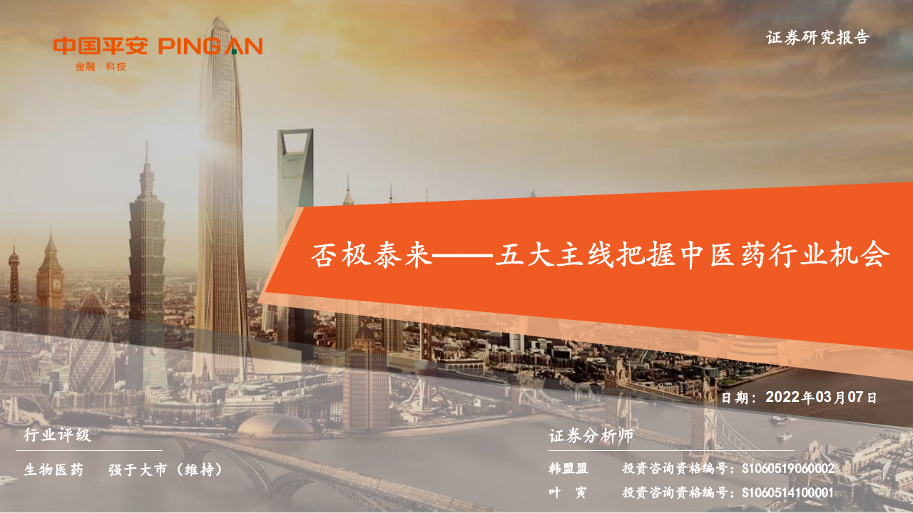报告围绕五条核心主线把握中药投资机会:一是中药创新药,受益于新注册分类以临床价值为导向和“三结合”审评体系的理清,以及医保对创新药放量的支持。二是品牌OTC中药,以院外市场为主,受医保控费影响小,受益于消费升级,具备更强的成本转嫁能力和较高的盈利能力。三是中药配方颗粒,作为中药板块的高成长赛道,试点结束后进入量价齐升阶段,有望达到千亿以上规模,且行业集中度将向具有先发优势的龙头企业集中。四是短期关注医保限制放松的中药注射剂,企业自发的安全性、有效性评价得到验证后,有望陆续解除限制,带来短期业绩弹性。五是中医医疗服务,线上线下结合模式有望解决中医医疗服务供给不足及结构错配问题。