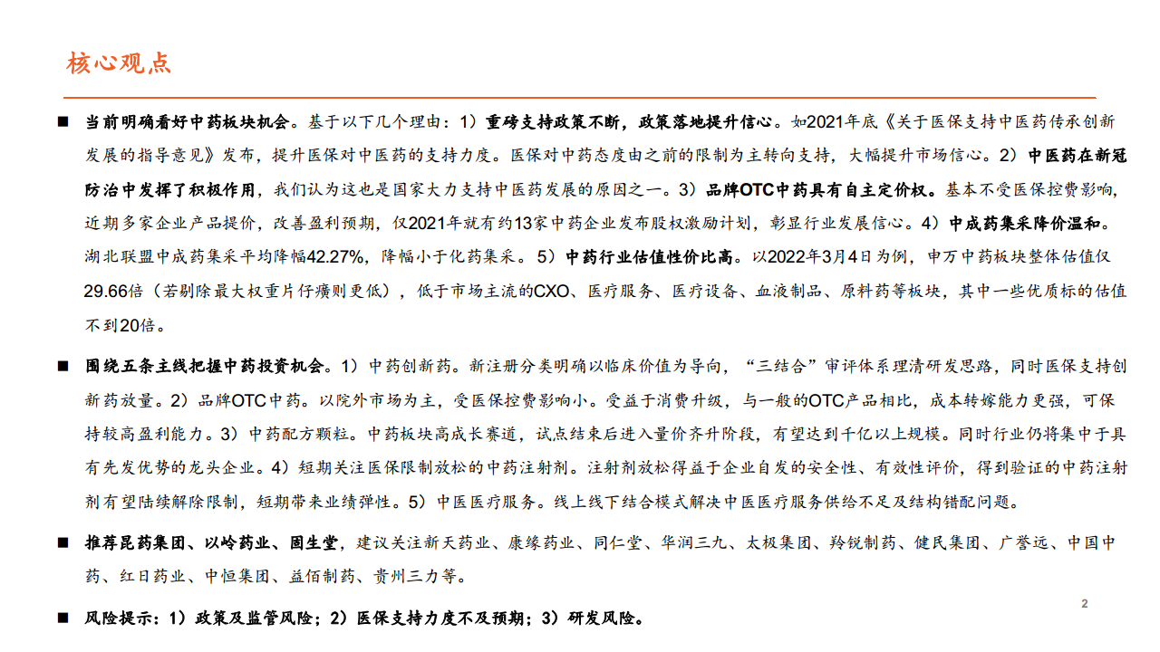 当前明确看好中药板块的投资机会,主要基于多重利好因素的叠加。国家层面重磅支持政策持续出台,如2021年底《关于医保支持中医药传承创新发展的指导意见》发布,显著提升了医保对中医药的支持力度,使医保态度从限制转向支持,极大增强了市场信心。中医药在新冠肺炎防治中发挥的积极作用,也成为国家大力支持中医药发展的重要原因。此外,品牌OTC中药凭借自主定价权,基本不受医保控费影响,近期多家企业产品提价改善了盈利预期,且2021年约有13家中药企业发布股权激励计划,彰显了行业发展信心。中成药集采降价幅度相对温和,湖北联盟中成药集采平均降幅为42.27%,远低于化药集采。经过长期回调,中药行业估值性价比高,截至2022年3月4日,申万中药板块整体估值仅29.66倍(剔除片仔癀后更低),低于市场主流的CXO、医疗服务、医疗设备等板块,部分优质标的估值甚至不到20倍。