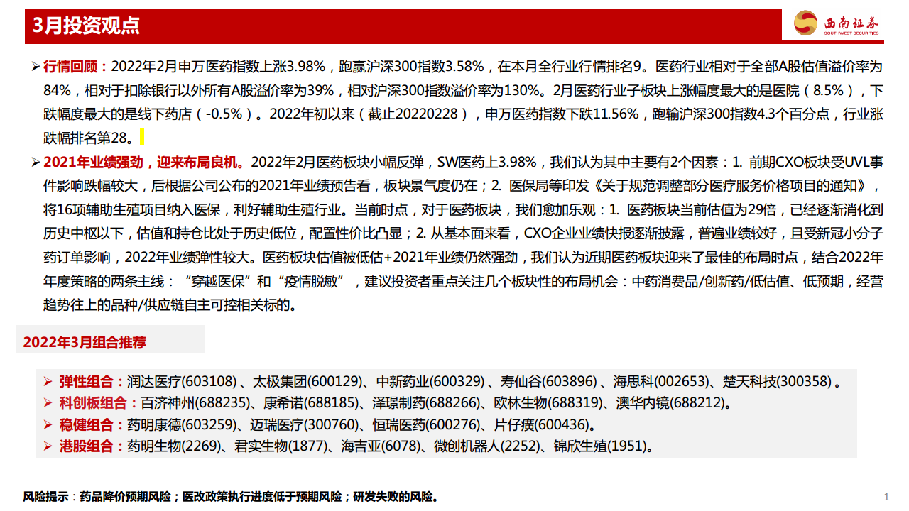 本报告核心观点指出,2022年2月医药板块经历小幅反弹,但整体估值仍处于历史中枢以下,配置性价比凸显。2021年医药企业业绩表现强劲,特别是CXO板块景气度持续,且受新冠小分子药订单影响,2022年业绩弹性较大。医保政策对辅助生殖项目纳入医保的调整,也为相关细分领域带来利好。当前时点被视为医药板块的最佳布局时点,预示着未来有望迎来配置良机。