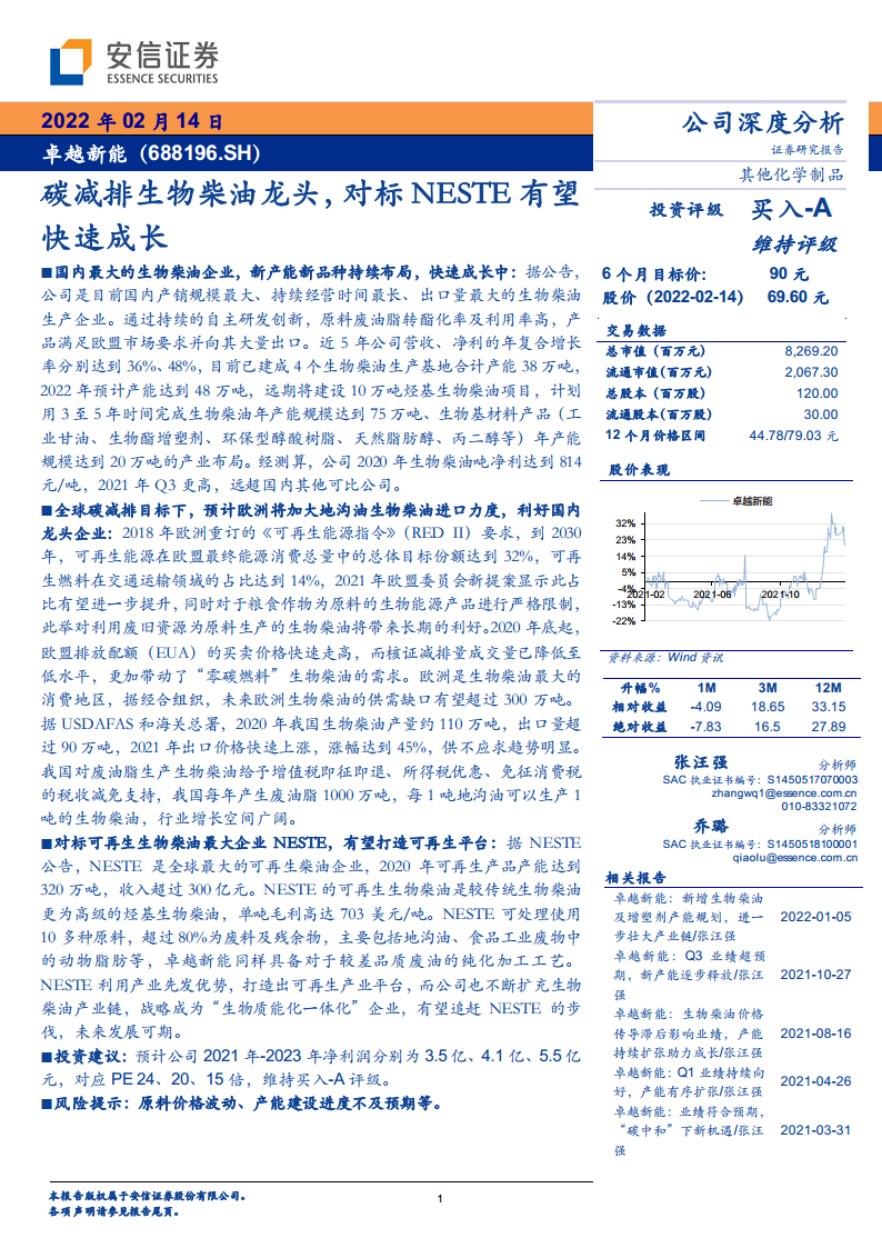 - 卓越新能以生物柴油起家,规划烃基生物柴油产能,并持续拓展以生物柴油产业为基础的可降解生物基产品,不断扩充产业链。其发展战略与NESTE相似,有望追赶NESTE的步伐,未来发展可期。