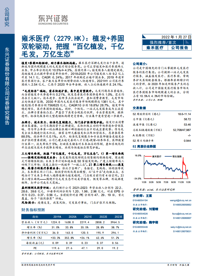 雍禾医疗凭借其“植发+养固”双轮驱动的战略,在中国毛发医疗服务市场中占据领先地位。公司通过持续的品牌建设、技术创新和标准化运营,有效把握了行业扩容和集中度提升带来的巨大机遇。植发业务的稳定增长、医疗养固业务的快速崛起,以及围绕毛发生态外延的美学植发等多元化品牌布局,共同构成了公司未来强劲的增长曲线。面对“百亿植发,千亿毛发,万亿生态”的广阔市场,雍禾医疗已展现出强大的市场领导力、盈利能力和可持续发展潜力。尽管存在疫情反复、政策趋严、医疗事故和门店扩张不及预期等风险,但公司凭借其核心竞争力及清晰的战略规划,有望持续实现业绩增长,因此给予“强烈推荐”评级。