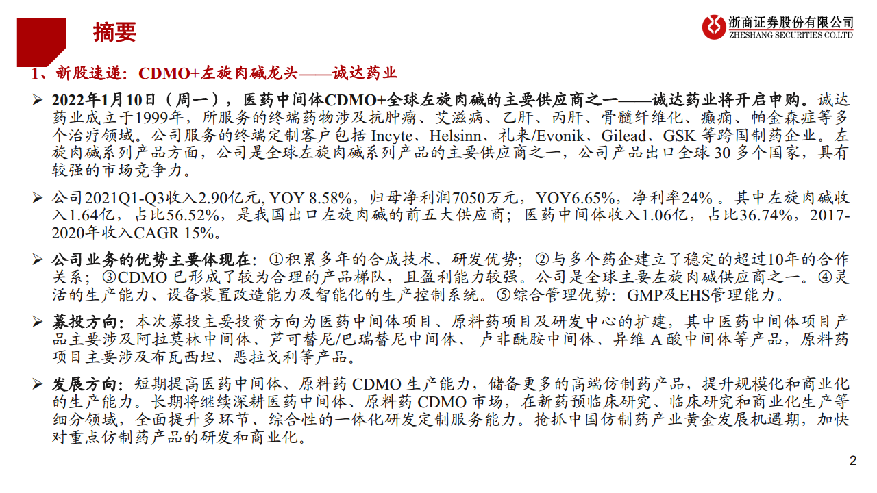 诚达药业于2022年1月10日(周一)开启申购,作为一家成立于1999年的医药中间体CDMO企业,同时也是全球左旋肉碱系列产品的主要供应商之一。公司服务的终端药物涵盖抗肿瘤、艾滋病、乙肝、丙肝、骨髓纤维化、癫痫、帕金森症等多个治疗领域,其定制客户包括Incyte、Helsinn、礼来/Evonik、Gilead、GSK等国际知名制药企业。在左旋肉碱系列产品方面,诚达药业的产品出口至全球30多个国家,展现出强大的市场竞争力。