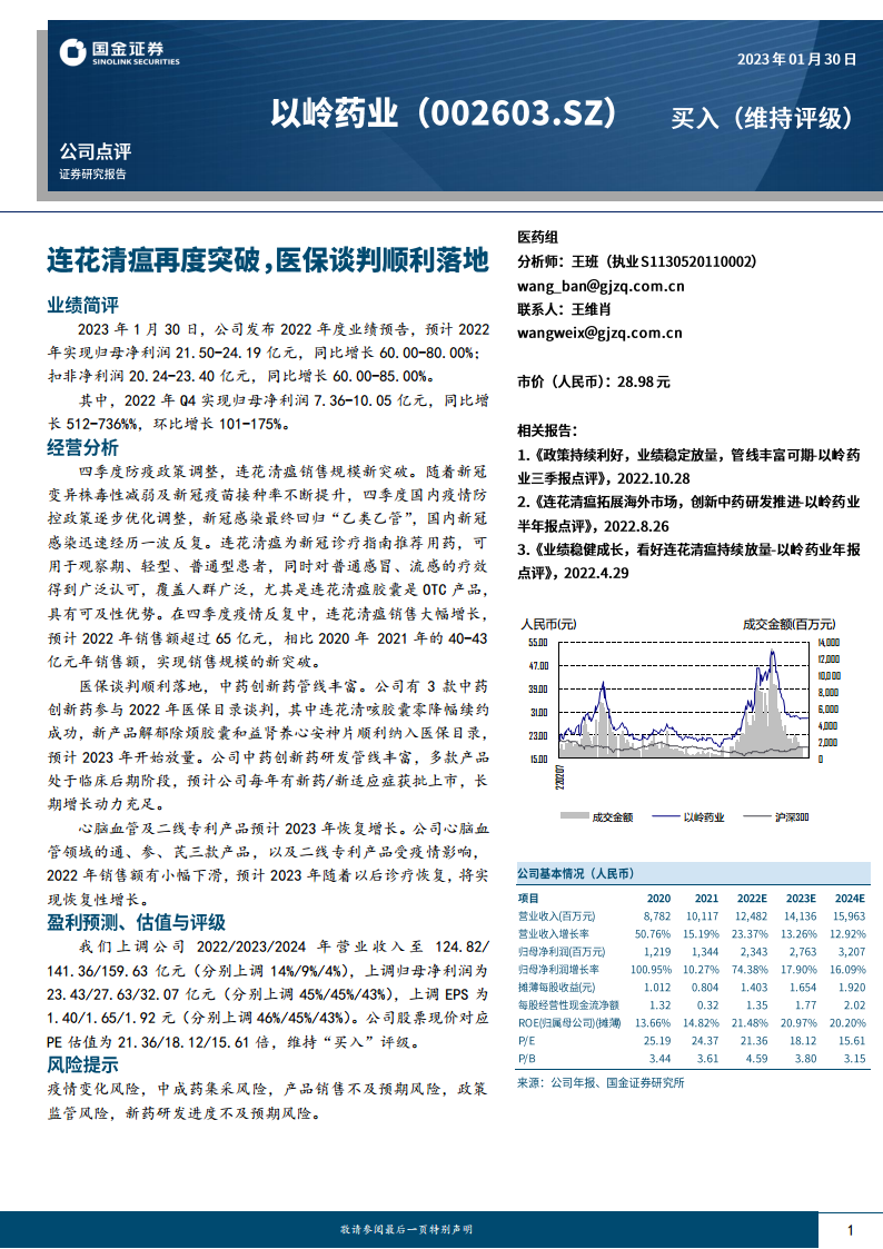 2022年,公司凭借连花清瘟产品的销售爆发,实现了归母净利润60-80%的强劲增长,尤其第四季度业绩表现亮眼。展望未来,公司通过成功的医保谈判,将连花清咳胶囊续约并使两款新产品纳入医保,加之丰富的中药创新药研发管线,为2023年及后续年度的持续增长奠定了坚实基础。尽管心脑血管及二线专利产品在2022年受疫情影响小幅下滑,但预计2023年将恢复增长。分析师已上调公司未来三年的营收和净利润预测,并维持“买入”评级,但同时提示了疫情、集采、销售不及预期、政策监管及新药研发等潜在风险。