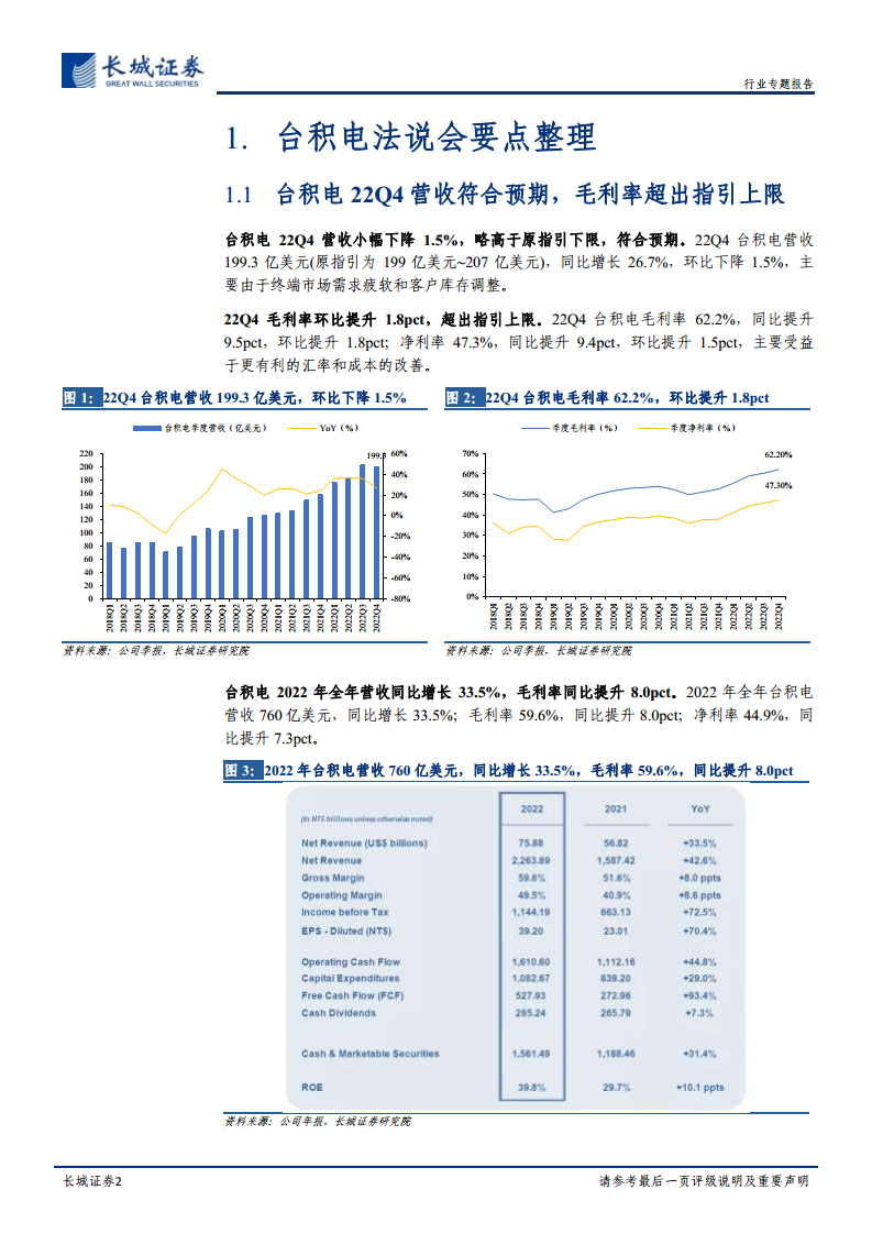 本报告基于台积电2022年财报及2023年展望,深入分析了当前电子元器件行业的市场状况和未来趋势。报告指出,尽管2023年上半年半导体行业面临终端需求疲软和客户库存调整的挑战,但供应链库存预计将在上半年触底,并在下半年迎来复苏。高性能计算和汽车电子领域的需求持续强劲,为行业提供了重要的增长支撑。台积电在先进制程技术(如N3、N2)方面持续领先,并积极进行全球化布局以应对地缘政治风险。鉴于当前申万半导体板块估值处于历史低位,且预计消费电子需求将在23Q2开始反转,报告建议关注具有“龙头低估”特征的半导体公司,以把握行业复苏带来的投资机会。