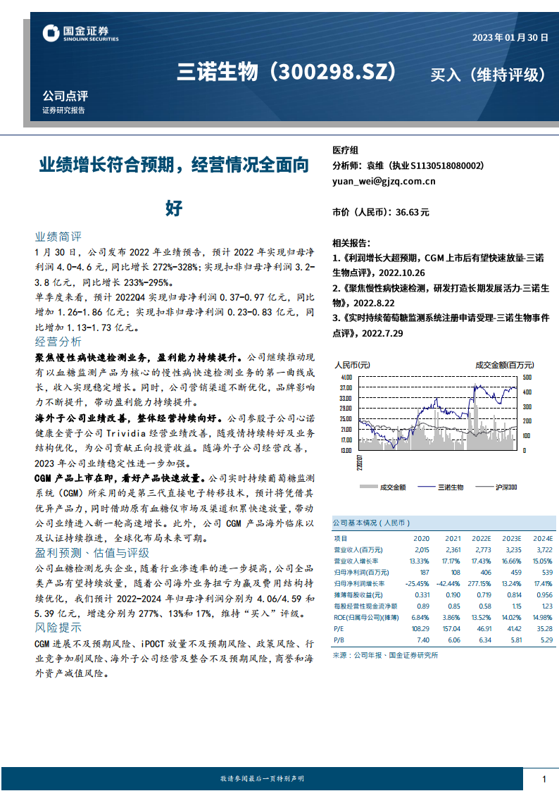 本报告核心观点指出,三诺生物在2022年实现了显著的业绩增长,归母净利润预计同比增长272%-328%。这一增长主要得益于其在慢性病快速检测业务上的持续深耕、海外子公司经营状况的显著改善,以及即将上市的实时持续葡萄糖监测系统(CGM)的巨大市场潜力。公司通过优化营销渠道和提升品牌影响力,持续增强盈利能力,并预计未来几年将进入新一轮高速增长期。