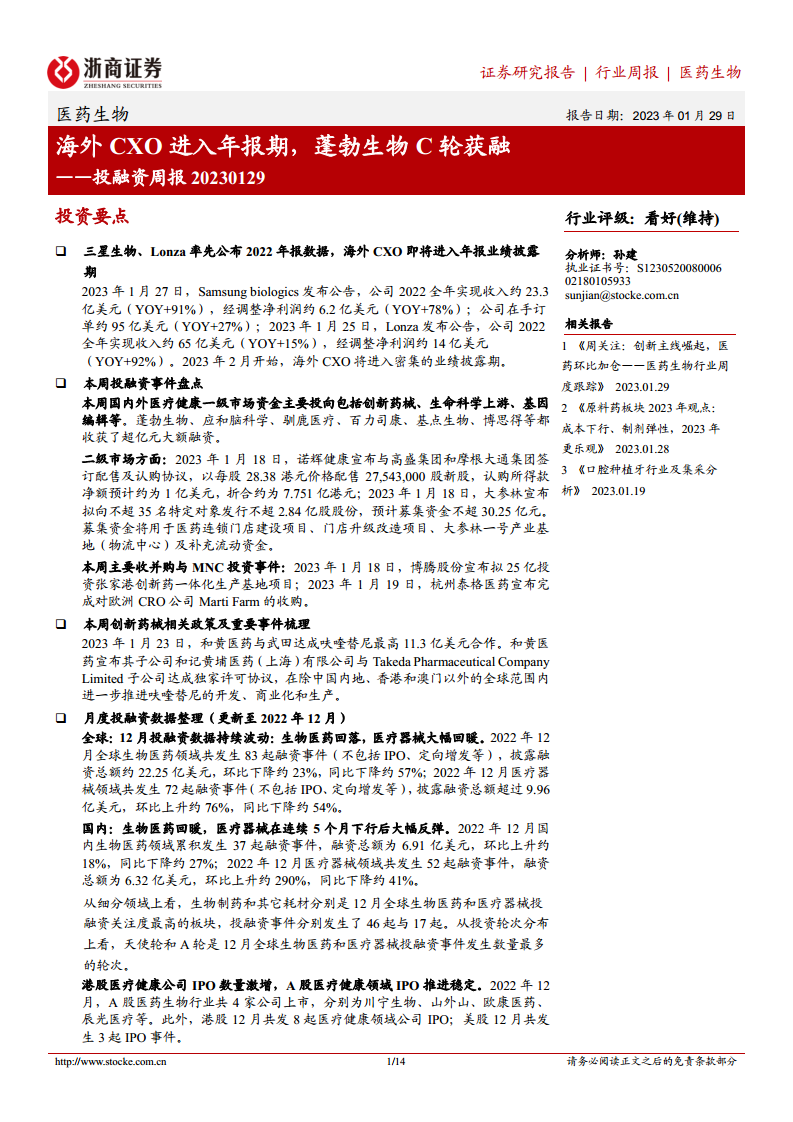 医药生物投融资周报:海外CXO进入年报期,蓬勃生物C轮获融