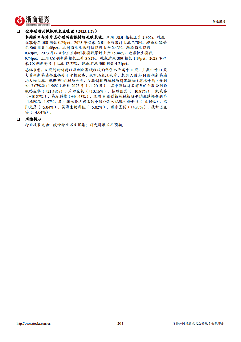 本周报深入分析了医药生物行业的最新动态,揭示了海外CXO企业在2022年实现了显著的业绩增长和积极的全球扩张战略。同时,医疗健康领域的投融资活动保持活跃,创新药械、生命科学上游和基因编辑等细分领域持续受到资本青睐,一级市场大额融资和二级市场配售增发事件频发。尽管月度投融资数据在全球范围内有所波动,但国内市场呈现回暖和大幅反弹趋势。创新药械板块在全球主要市场指数中表现强劲,显示出市场对创新驱动型医疗发展的信心。然而,投资者仍需关注行业政策变动、疫情发展及研发进展等潜在风险。