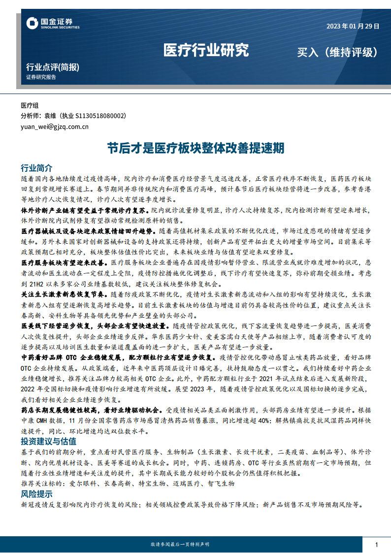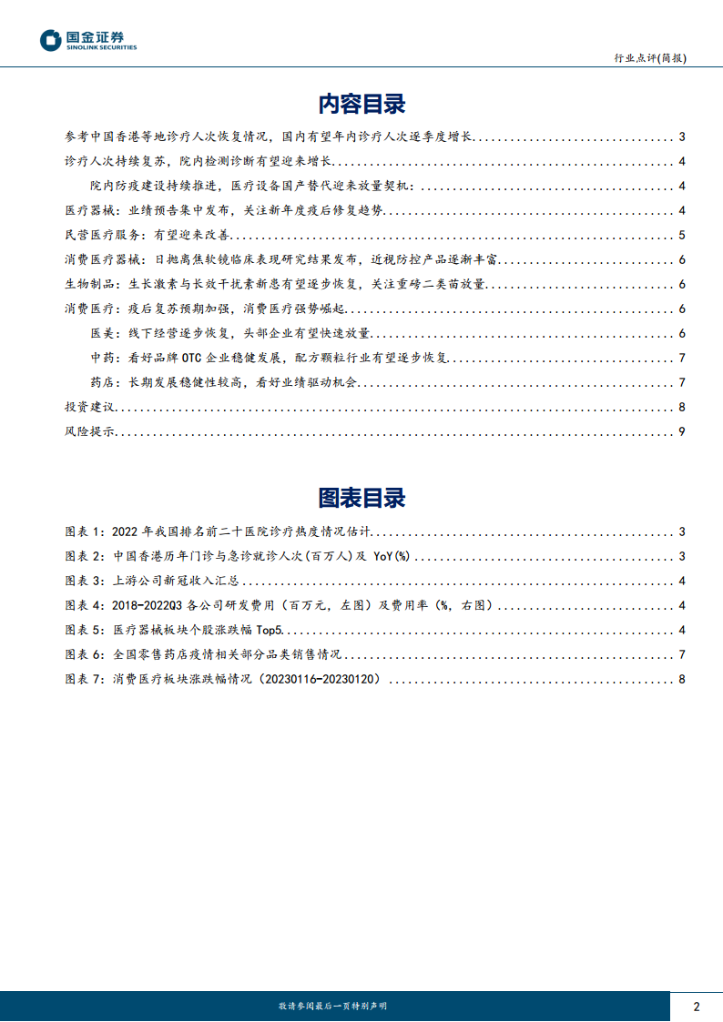 本报告核心观点指出,随着国内疫情高峰的度过,院内诊疗和消费医疗的经营景气度迅速改善,医疗秩序逐步恢复常态。预计春节后医疗板块经营将进一步向好,诊疗人次有望逐季度增长,从而推动医药医疗板块回归常规增长轨道。