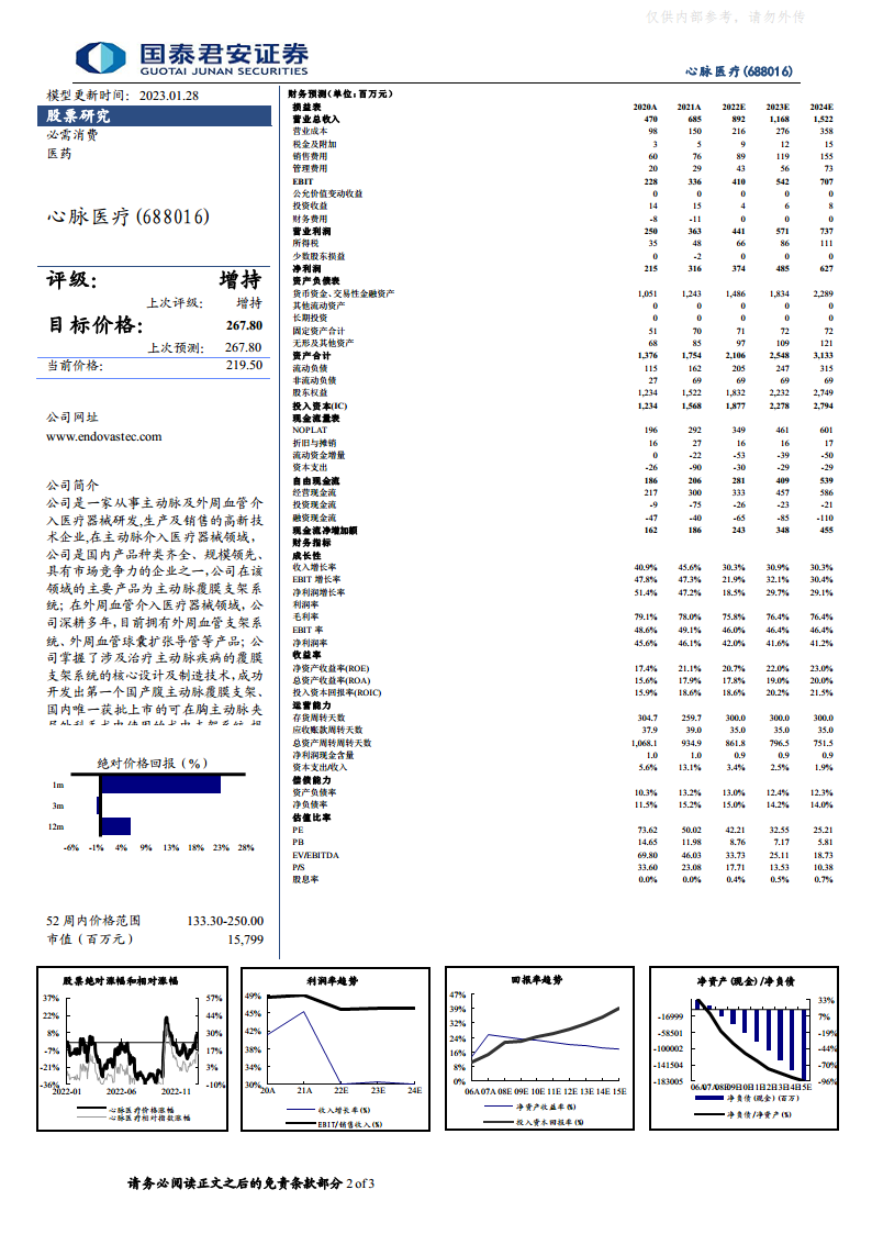 心脉医疗在2022年展现了稳健的经营韧性,全年业绩实现可观增长,尽管第四季度受疫情影响增速有所放缓。随着国内疫情形势的持续好转,终端手术量有望逐步恢复,为公司核心业务的复苏提供有利条件。同时,公司在研管线的持续推进和新获批产品的市场导入,将为心脉医疗提供持久的增长动能。尽管存在集采、疫情反复和研发不及预期等风险,但公司凭借其丰富的产品布局和市场领先地位,有望在后疫情时代延续高增长态势,维持“增持”评级。