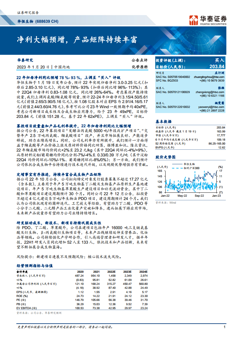 华恒生物在2022年实现了显著的业绩增长,预计归母净利润同比大幅预增78%-93%,扣非后归母净利润更是预计同比增长96%-113%。这一强劲表现主要得益于募投项目的产能有效释放以及产品毛利率的提升。鉴于公司业绩超出预期且未来增长潜力巨大,华泰研究将公司投资评级上调至“买入”,并大幅提升了目标价和盈利预测,反映了市场对其价值的重新评估。