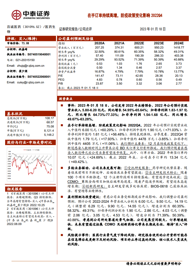 百诚医药(301096):在手订单持续高增,防疫政策变化影响2022Q4