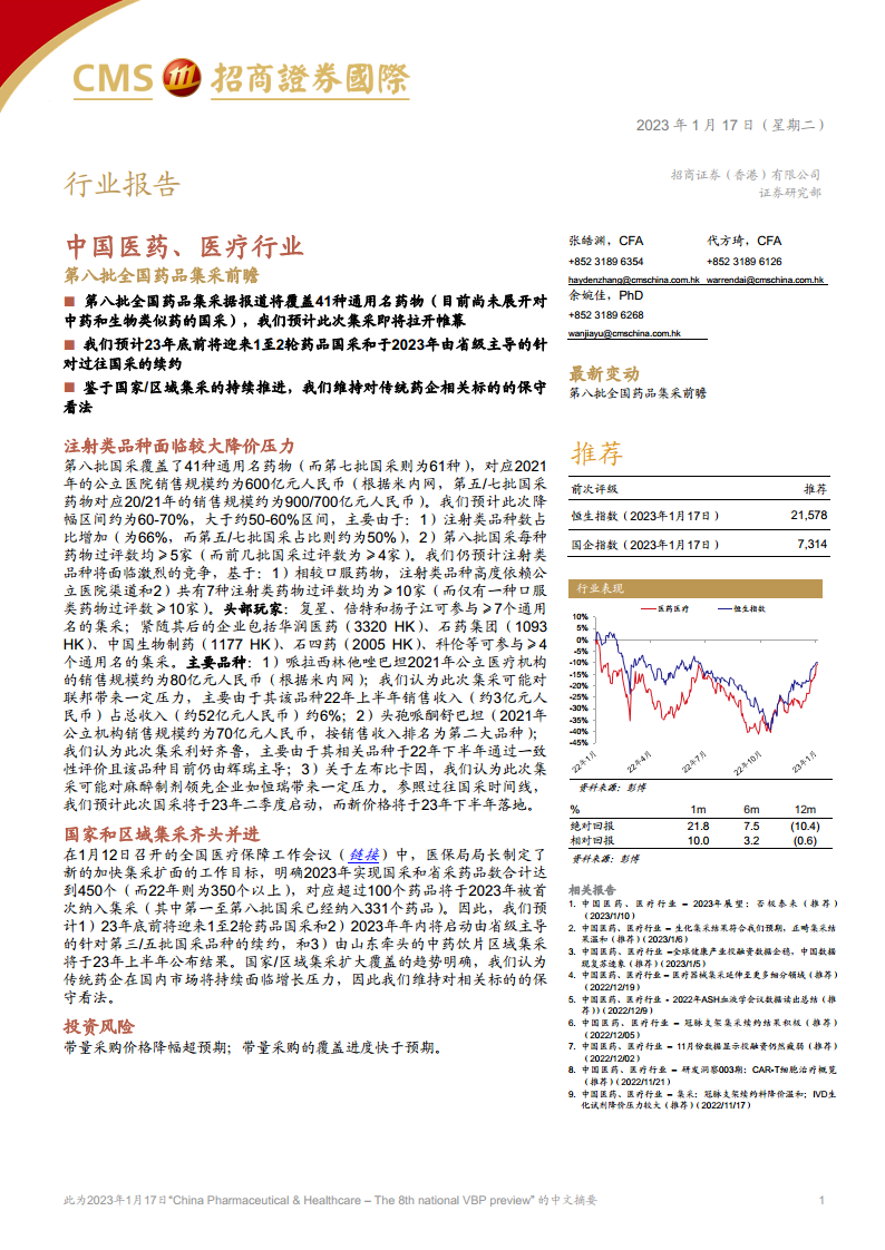 中国医药、医疗行业:第八批全国药品集采前瞻