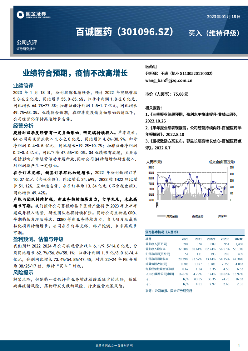 中心思想 业绩稳健增长与市场预期 尽管2022年第四季度受到疫情负面影响,百诚医药全年业绩仍保持高速增长态势,营收和归母净利润均符合市场预期,分别同比增长55.0%-65.6%和64.7%-77.3%。 公司通过持续的研发投入和战略性产能扩张,有效对冲了短期外部不利因素,展现出强大的经营韧性。 战略布局与未来发展潜力 公司在手订单充裕,新签订单环比加速增长,为未来业绩提供了坚实保障。 通过临平区新产能建设、研发团队扩张以及生物类CRO、早期药物发现及筛选、CDMO等新业务的持续拓展,公司正积极构建多元化增长引擎,预计未来将保持高成长性。 主要内容 2022年业绩回顾与季度分析 全年业绩超预期增长: 公司预计2022年实现营收5.8-6.2亿元,同比增长55.0-65.6%;归母净利润1.8-2.0亿元,同比增长64.7%-77.3%;扣非归母净利润1.5-1.7亿元,同比增长49.7%-63.3%。业绩表现符合市场预期,显示出公司强劲的增长势头。 第四季度业绩受疫情及研发投入影响: 2022年第四季度营收1.6-2.0亿元,同比增长4.6%-30.9%;归母净利润0.4-0.5亿元,同比下降19.2%-10.7%;扣非归母净利润0.2-0.4亿元,同比下降47.5%-10.0%。业绩增速放缓主要归因于疫情对正常经营活动的负面影响以及公司持续增加的研发投入。 订单状况与未来增长潜力 新签订单加速增长: 2022年公司新增订单总额达10.07亿元(含税),同比增长24.69%。其中,下半年新签订单较上半年环比增长51.12%,表明订单获取能力显著增强。 在手订单充裕: 截至报告期末,公司在手订单金额为13.34亿元(不含税),同比增长49.42%,为公司未来业绩的持续增长提供了坚实保障。 战略扩张与新业务布局 产能与研发团队持续扩张: 公司募投的临平区新产能预计将于2023年上半年建成并投入运营,这将大幅提升服务能力。同时,研发团队的持续扩张将进一步强化公司的创新实力。 新业务领域积极拓展: 公司正积极发力生物类CRO、早期药物发现及筛选、CDMO等新业务,并持续推动自主研发及成果转化项目,这些多元化业务布局有望成为公司未来业绩增长的新引擎。 财务预测与投资评级 未来三年业绩高增长预测: 国金证券预计公司2022-2024年营业收入将分别达到6.1亿元、9.5亿元和14.8亿元,同比增长62.7%、56.6%和55.1%。归母净利润预计分别为1.9亿元、3.0亿元和4.4亿元,同比增长73.4%、54.8%和47.4%。 维持“买入”评级: 基于对公司强劲增长潜力和合理估值的判断,国金证券维持对百诚医药的“买入”评级,并给出了2022-2024年PE分别为38/25/17倍的估值。历史推荐记录显示,自2022年3月起,国金证券已多次给予“买入”评级。 关键财务指标分析 盈利能力: 预计2022-2024年净利率维持在29.7%-31.6%之间,净资产收益率(ROE)预计从2022年的7.74%提升至2024年的13.97%。 运营效率: 应收账款周转天数和存货周转天数预计保持稳定,显示公司在资产管理方面的效率。 现金流状况: 经营活动现金净流量预计持续增长,从2022年的363百万元增至2024年的707百万元,表明公司内生现金创造能力强劲。 风险提示 市场与业务风险: 包括解禁风险、仿制药一致性评价业务增速放缓或减少的风险、新冠病毒疫情风险以及药物研发失败的风险。 政策与监管风险: 行业监管政策的变化可能对公司的经营和发展产生不利影响。 总结 百诚医药在2022年展现出强劲的业绩增长,全年营收和归母净利润均超预期,尽管第四季度受到疫情和研发投入增加的短期影响。 公司通过充裕的在手订单和加速增长的新签订单,为未来的持续发展奠定了坚实基础。 战略性的产能扩张、研发团队建设以及生物类CRO、早期药物发现及筛选、CDMO等新业务的积极布局,预示着公司未来高成长性可期。 国金证券维持“买入”评级,并预测公司未来三年营收和净利润将保持高速增长。 投资者需关注解禁、业务增速放缓、疫情、研发失败及政策变化等潜在风险。
