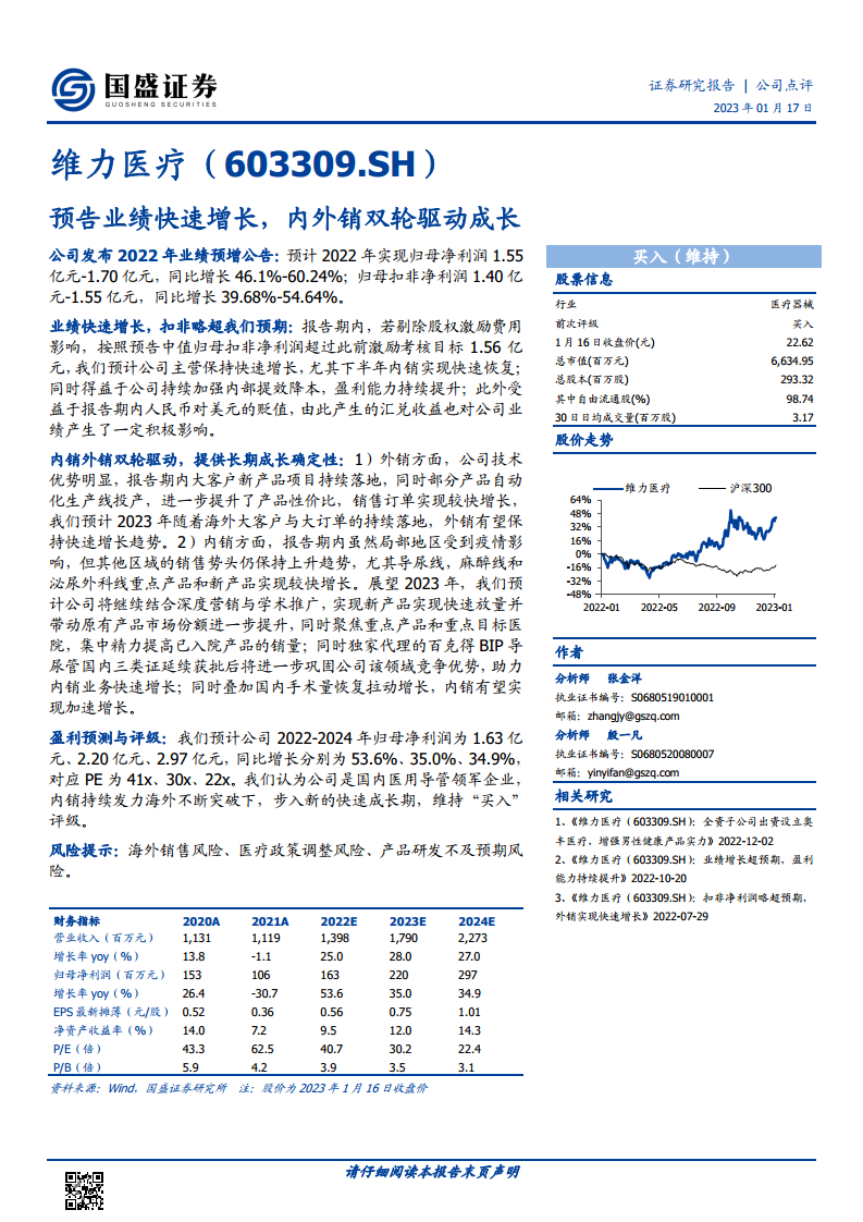 维力医疗在2022年实现了强劲的业绩增长,归母净利润和扣非净利润均大幅提升,且扣非净利润略超预期。这一增长主要得益于公司主营业务的快速扩张、内部提效降本以及汇兑收益的积极影响。公司通过内外销双轮驱动战略,在外销市场凭借技术优势和自动化生产线持续获得大客户订单,预计2023年将保持快速增长。内销市场则通过深度营销、学术推广、新产品放量以及重点产品和医院的聚焦,叠加国内手术量恢复,预计将实现加速增长。基于对公司未来盈利能力的积极预测,国盛证券维持“买入”评级,认为维力医疗已进入新的快速成长期,但投资者仍需关注海外销售、医疗政策和产品研发等潜在风险。