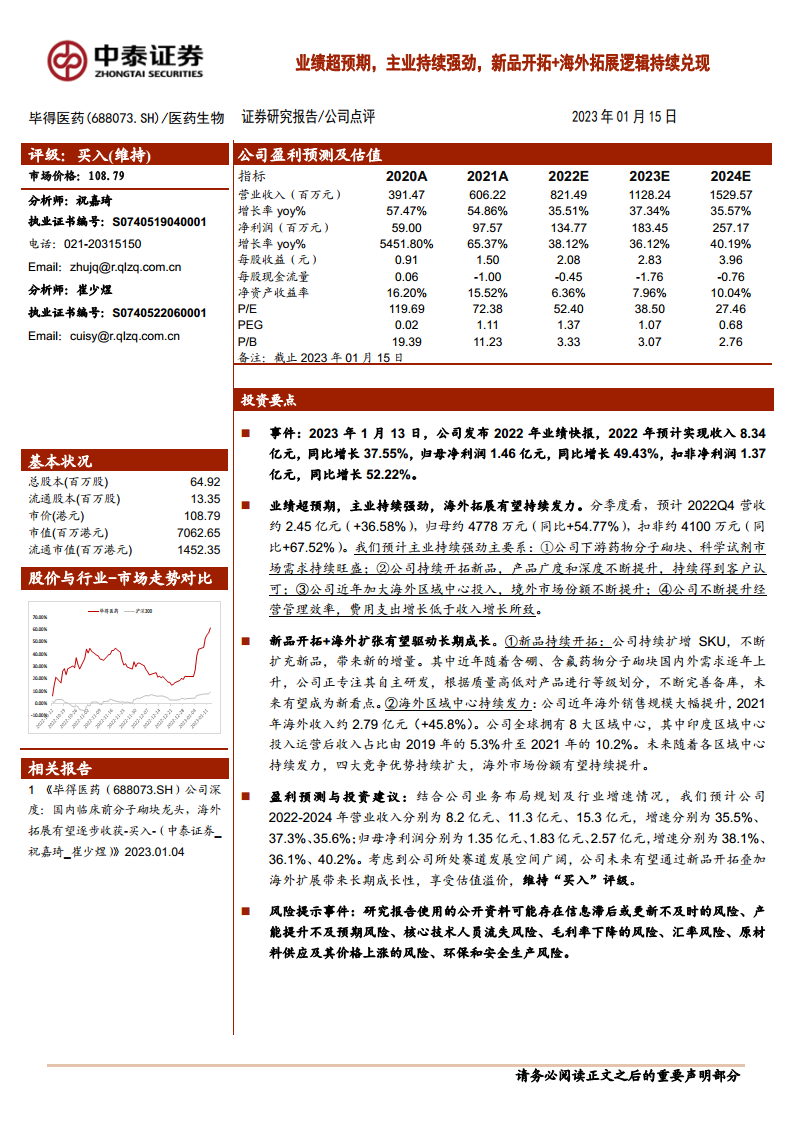 毕得医药2022年业绩表现强劲,营收和归母净利润均实现超预期增长,主要得益于下游市场需求的旺盛、新品的持续开拓、海外市场份额的提升以及经营管理效率的优化。公司通过不断扩增SKU,特别是专注含硼、含氟药物分子砌块的自主研发,以及全球8大区域中心的持续发力,构筑了长期成长的核心驱动力。分析师维持“买入”评级,看好公司在广阔赛道中的发展潜力。同时,报告也提示了信息滞后、产能提升不及预期、毛利率下降、原材料供应及价格波动以及环保安全生产等潜在风险。财务模型预测显示,公司未来几年营收和净利润将保持高速增长,盈利能力稳定,财务结构健康,估值随着业绩增长将趋于合理。