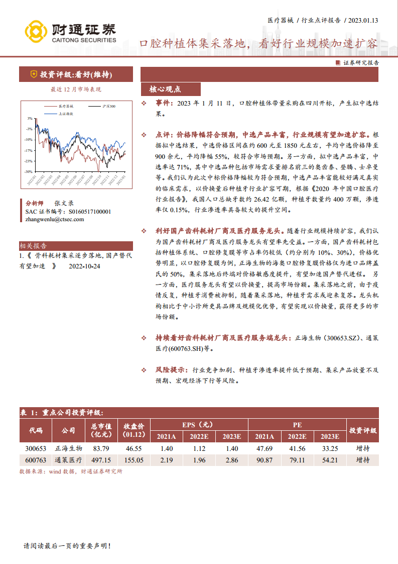 重点公司投资评级: 报告持续看好齿科耗材厂商及医疗服务端龙头企业。其中,正海生物(300653.SZ)和通策医疗(600763.SH)被明确提及。截至2023年1月12日,正海生物总市值83.79亿元,收盘价46.55元,2023年预计市盈率(PE)为33.25倍,投资评级为“增持”。通策医疗总市值497.15亿元,收盘价155.05元,2023年预计市盈率(PE)为54.21倍,投资评级同样为“增持”。