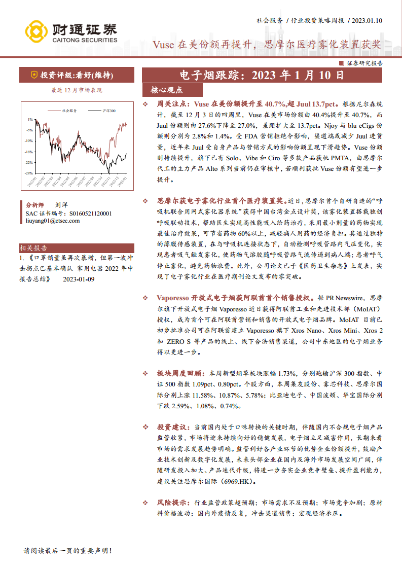 社会服务行业投资策略周报:电子烟跟踪:Vuse在美份额再提升,思摩尔医疗雾化装置获奖