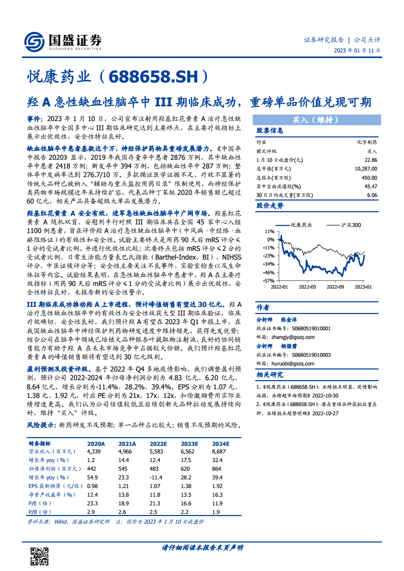 悦康药业的注射用羟基红花黄素A(羟A)治疗急性缺血性脑卒中III期临床研究的成功,标志着公司在神经保护药物领域取得重大突破。面对我国庞大的缺血性脑卒中患者群体和神经保护药物市场的巨大潜力,羟A凭借其优异的疗效和安全性,有望在2023年Q1申报上市,并成为销售额达30亿元级别的重磅单品。尽管2022年业绩受疫情影响有所调整,但羟A的商业化前景将显著提升公司未来的盈利能力,预计2023-2024年归母净利润将实现高速增长。鉴于公司较低的估值和创新大品种的持续拉动,报告维持“买入”评级,但同时提示了新药研发、单一品种占比及销售不及预期的风险。
