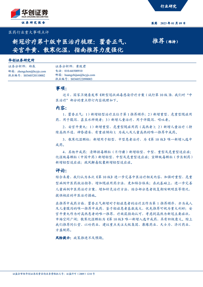 新冠诊疗第十版中医治疗梳理:藿香正气、安宫牛黄、散寒化湿,指南推荐力度强化