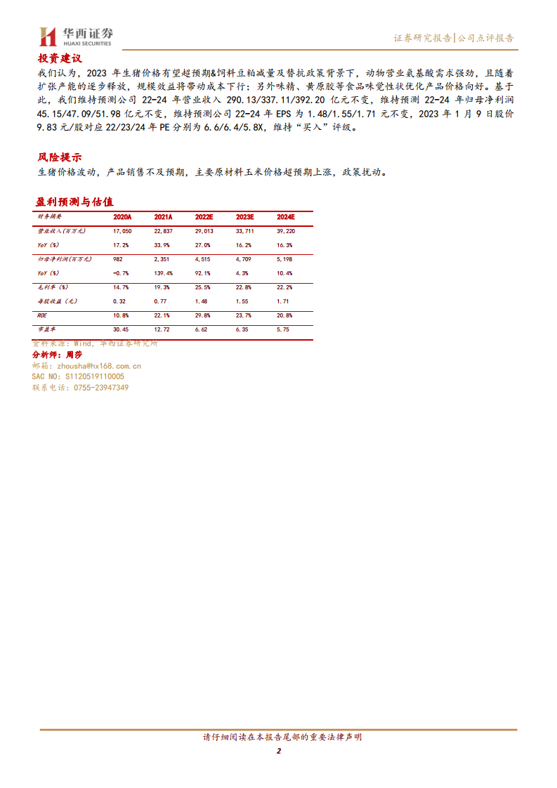 展望未来,梅花生物有望持续受益于动物营养氨基酸市场的强劲需求和食品味觉性状优化产品价格的向好趋势。随着公司扩张产能的逐步释放,规模效益将进一步带动成本下行,提升整体竞争力。华西证券维持对梅花生物的“买入”评级,并对其2022-2024年的营收和净利润保持乐观预测,认为公司当前的估值具有吸引力。尽管存在生猪价格波动、产品销售不及预期、原材料价格上涨和政策扰动等风险,但公司凭借其在核心产品领域的领先地位和市场机遇,展现出良好的投资价值和持续增长潜力。
