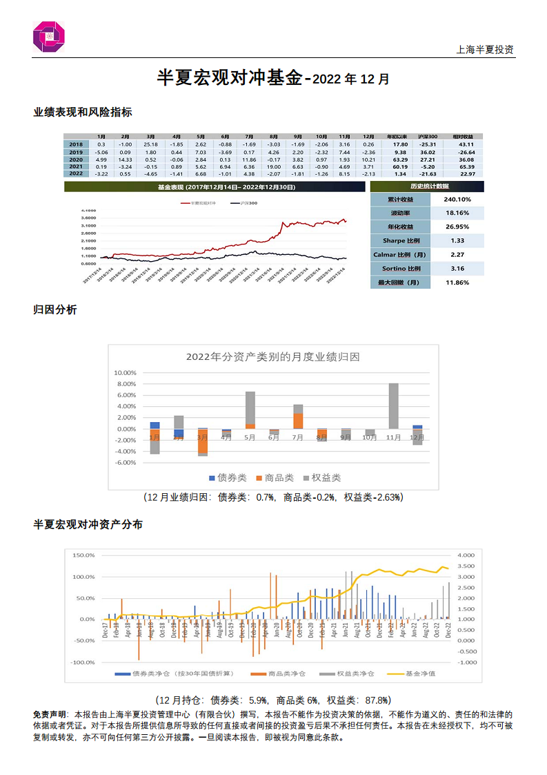 半夏宏观对冲基金在2022年12月的业绩归因显示,债券类贡献了0.7%的正收益,商品类录得-0.2%的亏损,权益类则亏损了-2.63%。截至12月末,基金的资产分布中,权益类持仓占比高达87.8%,债券类占比5.9%,商品类占比6%。