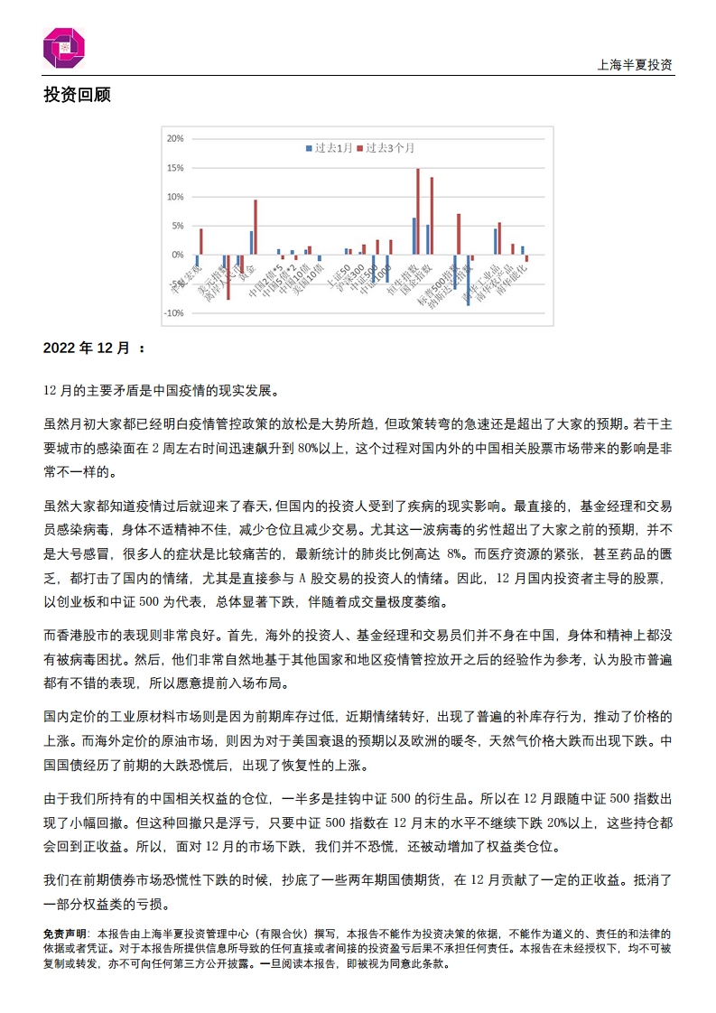 2022年12月,中国市场受疫情政策急速调整影响,国内A股(特别是创业板和中证500)因投资者情绪和交易员身体不适而显著下跌,成交量萎缩。相比之下,香港股市因海外投资者基于其他国家经验提前布局而表现良好。半夏宏观对冲基金在此背景下,权益类持仓(主要挂钩中证500)出现小幅回撤,但通过前期抄底两年期国债期货获得正收益0.7%,有效对冲了部分权益类亏损2.63%,商品类亏损0.2%,展现了宏观对冲策略的韧性。