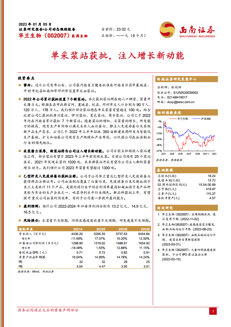 华兰生物近期获河南省卫健委批准在许昌市襄城县、开封市杞县和南阳市邓州市设置单采血浆站。加上此前已获批的潢川、伊川、夏邑、商水浆站,公司在2022年累计获批7个新浆站。这些新浆站所在地人口稠密,其中襄城县、杞县、邓州市总人口分别达90万人、120万人、178万人,采浆潜力巨大。预计部分浆站稳态年采浆量有望超过100吨。公司正积极推进新浆站建设,预计部分浆站将于2023年上半年实现采浆。目前公司拥有25个在采浆站,2021年采浆量约1030吨。随着新浆站的投入运营,预计2023年采浆量有望超过1300吨。为满足未来人血白蛋白、静注人免疫球蛋白及其他新产品的生产需求,公司已于2022年上半年征地350亩新建医药研发及智能化生产基地,以扩大生产规模和产业布局。