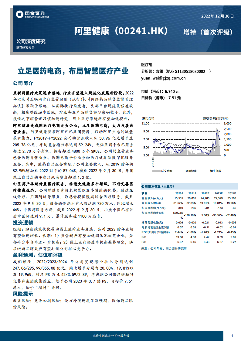 阿里健康(00241.HK)立足医药电商,布局智慧医疗产业